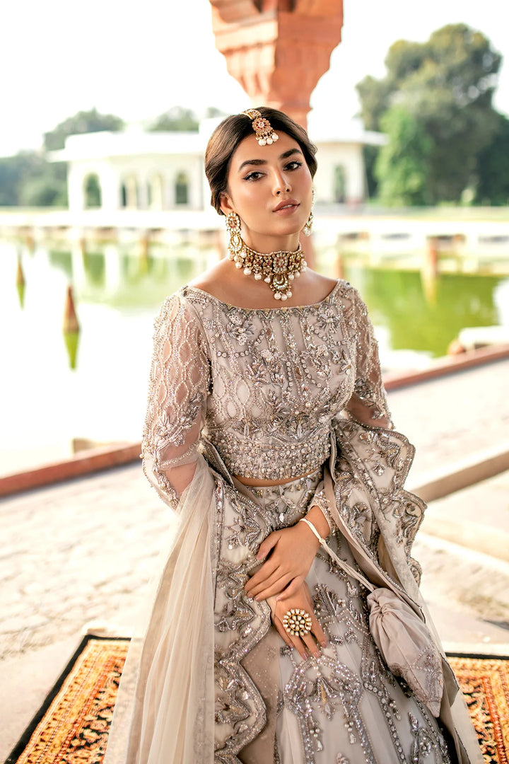 An ivory net Lehnga choli, having full sleeved boat necked blouse with hand embroidery on it done in shades of ivory, kilim beige and silver tila and is further embellished with...