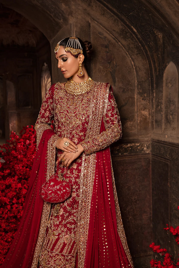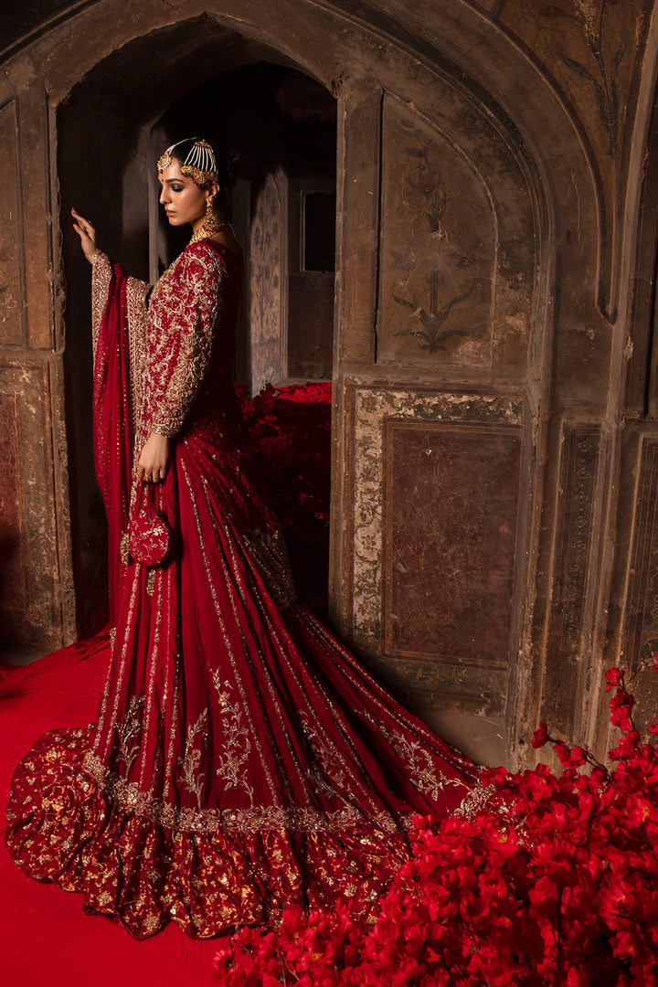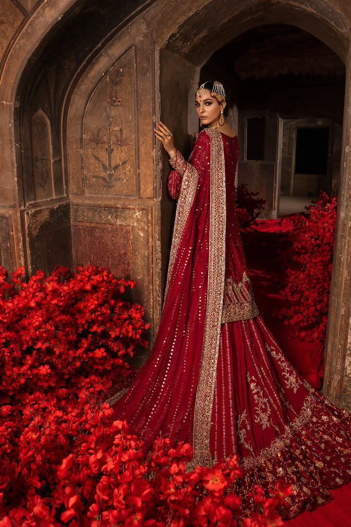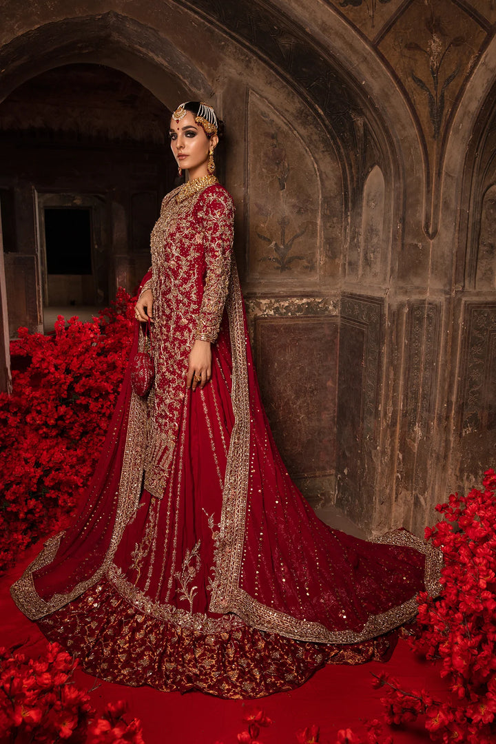 A fresh red colored shirt and farshi lehnga on khaddi net paired with a mukesh chiffon dupatta that has a heavy hand embellished border on all four sides. The shirt is...