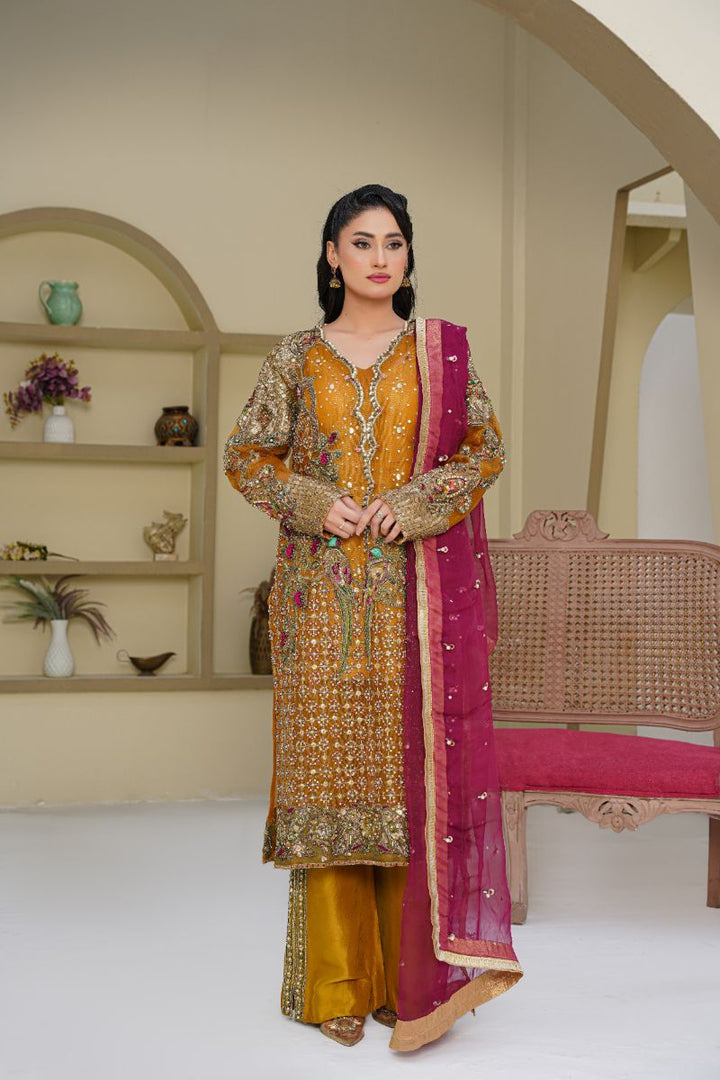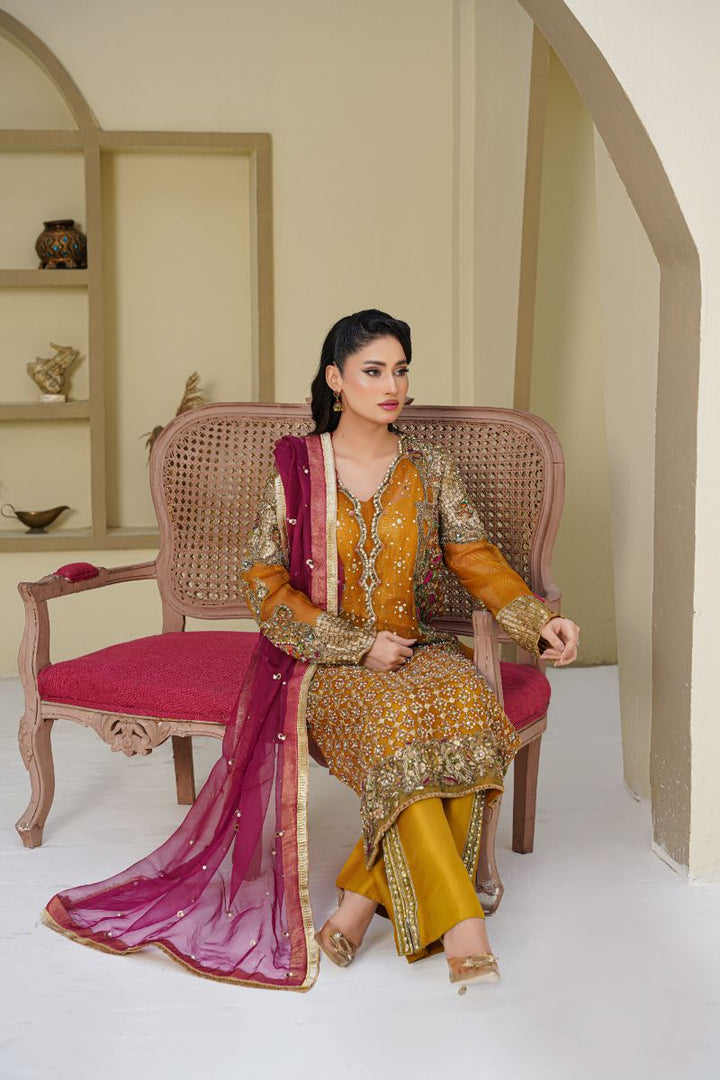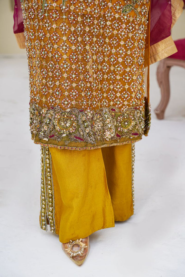 An exquisite mustard-toned outfit featuring a richly embellished organza shirt with intricate handwork, sequins, and delicate embroidery. Paired with raw silk bootcut pants for a graceful silhouette and complemented by a magenta organza dupatta adorned with fine detailing and a golden border. A perfect ensemble for festive and formal occasions.