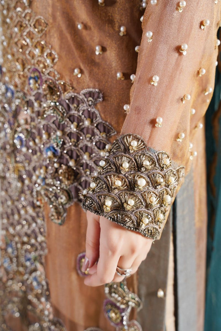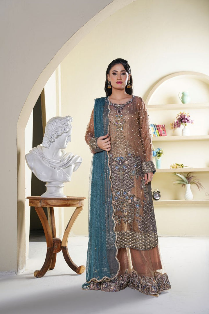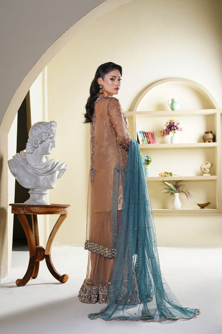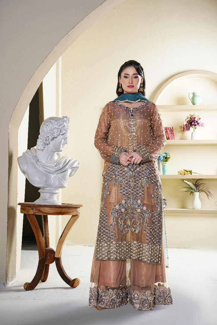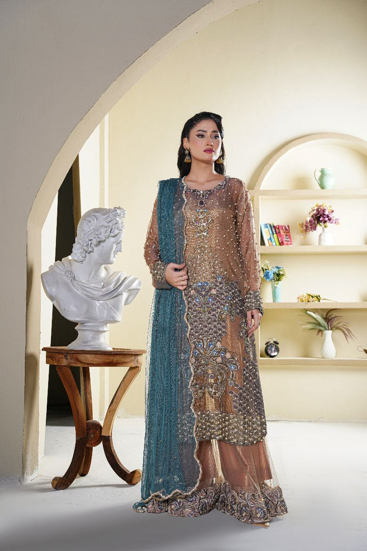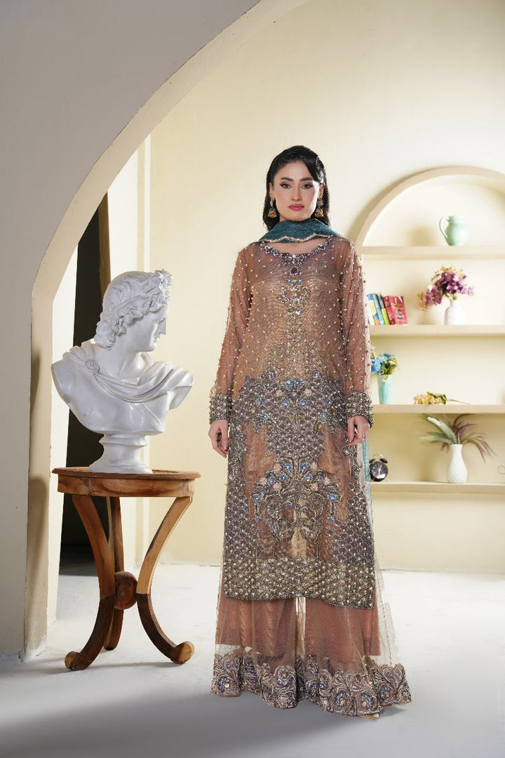 A majestic ensemble crafted with elegance and finesse. The shirt, beautifully tailored in premium organza, is adorned with intricate embellishments and shimmering handwork, creating a perfect blend of luxury and sophistication. It is paired with finely detailed organza trousers, adding a touch of grace and modern charm. The look is completed with a delicate net dupatta, softly embellished to enhance the outfit’s refined appeal.