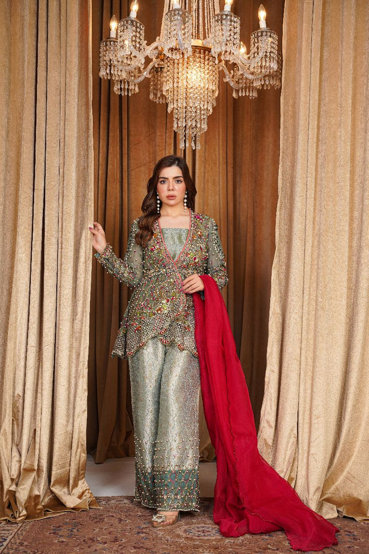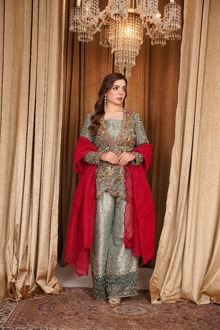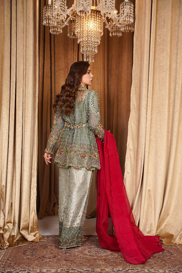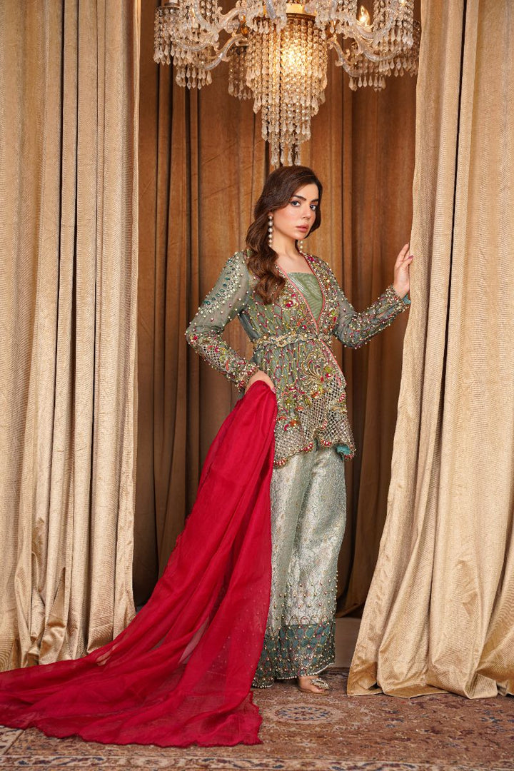 Color: Soft sage green with a deep red contrast dupatta