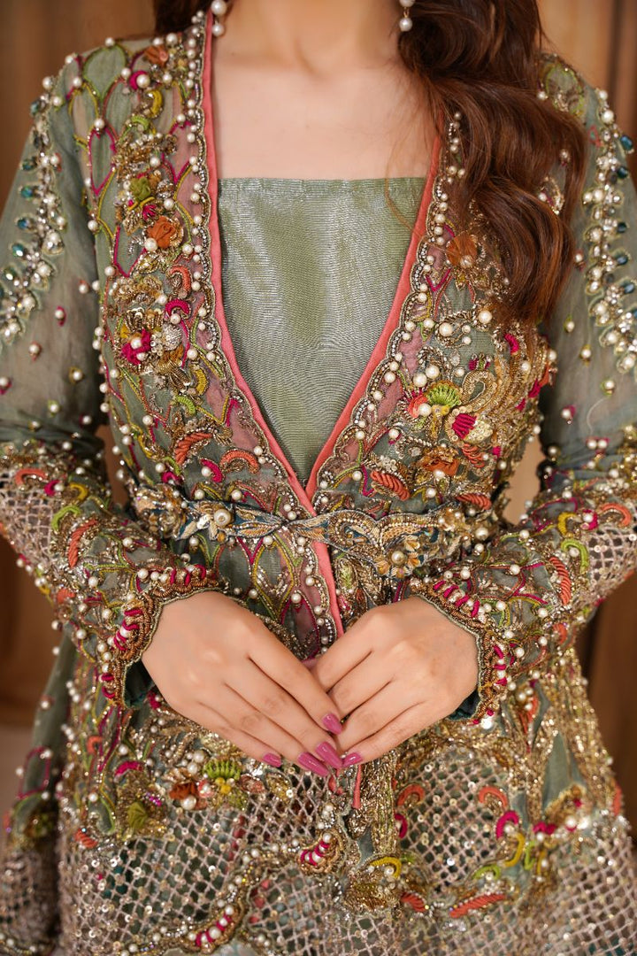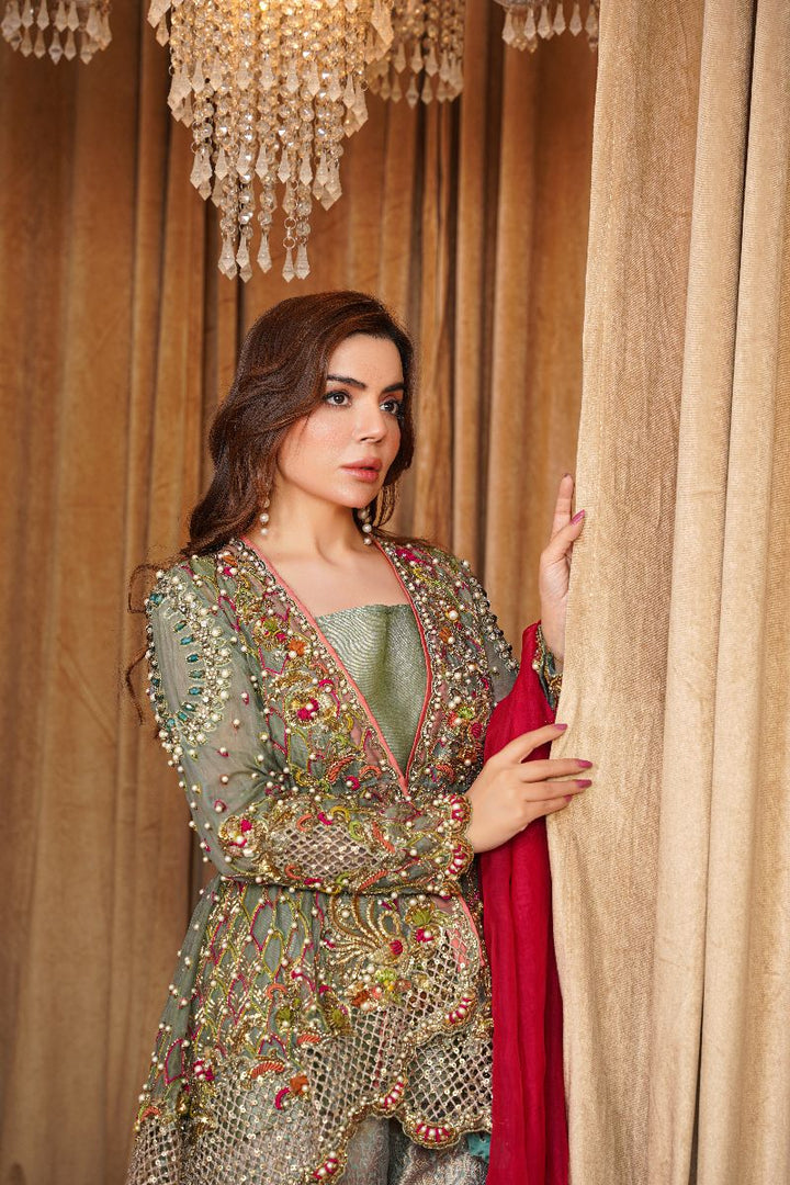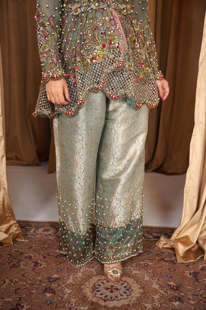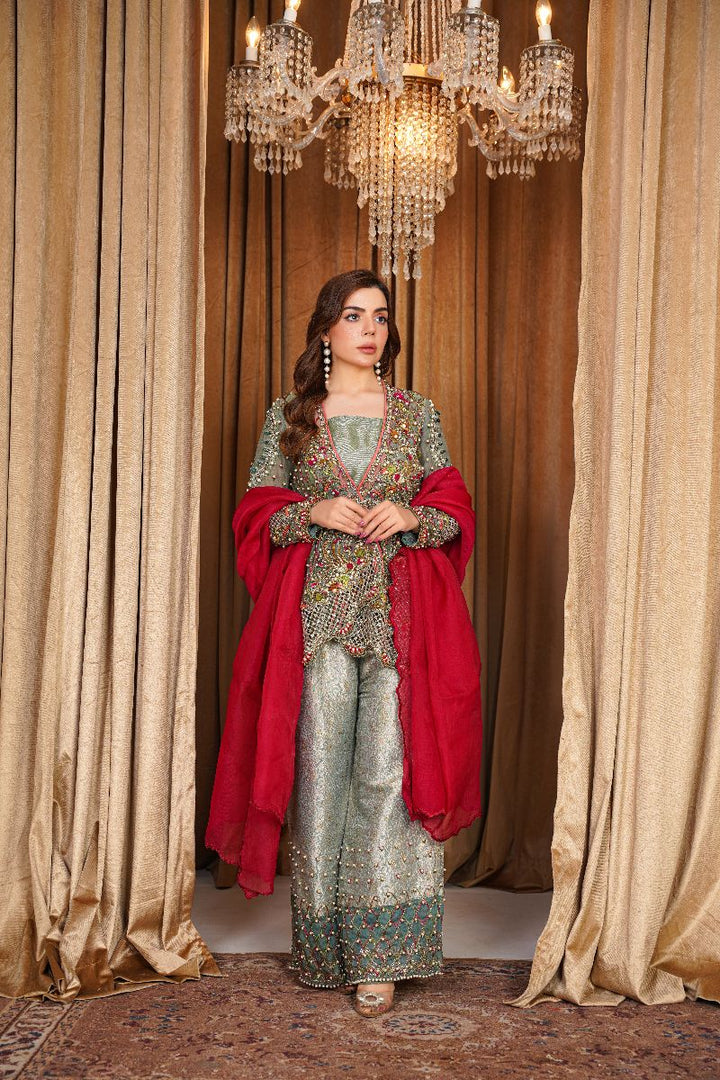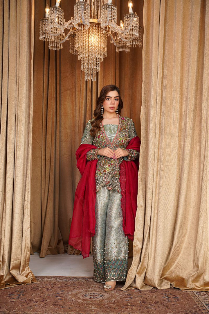 A breathtaking ensemble that perfectly blends elegance and luxury. The organza shirt is intricately adorned with exquisite handwork and embellishments, creating a timelessly graceful look. It is paired with a richly textured jamawar trouser that adds a regal touch to the outfit. Completing the look is a soft organza dupatta, draped beautifully for a sophisticated finish.
