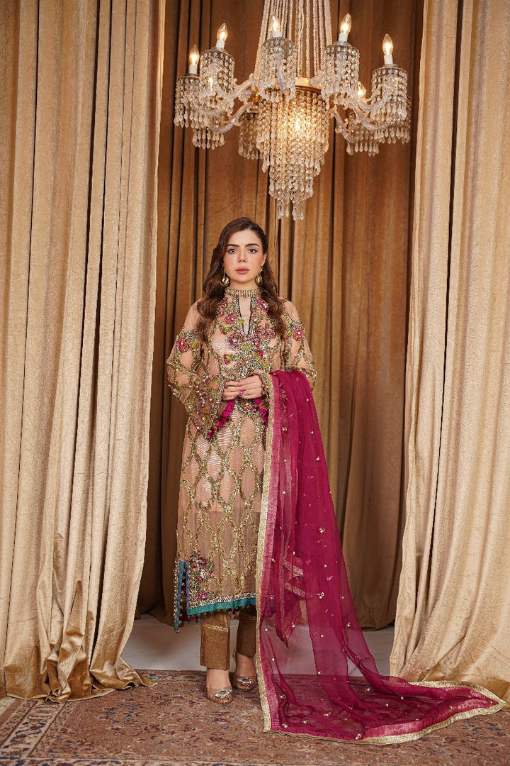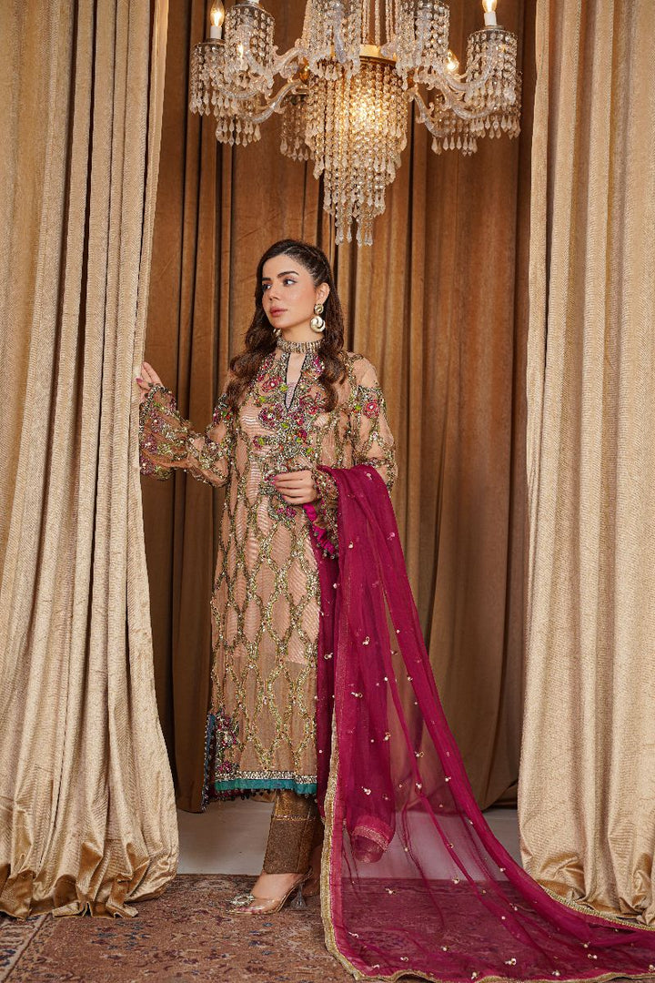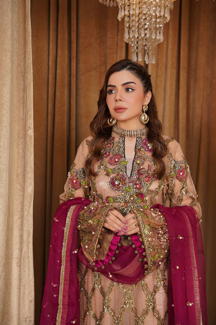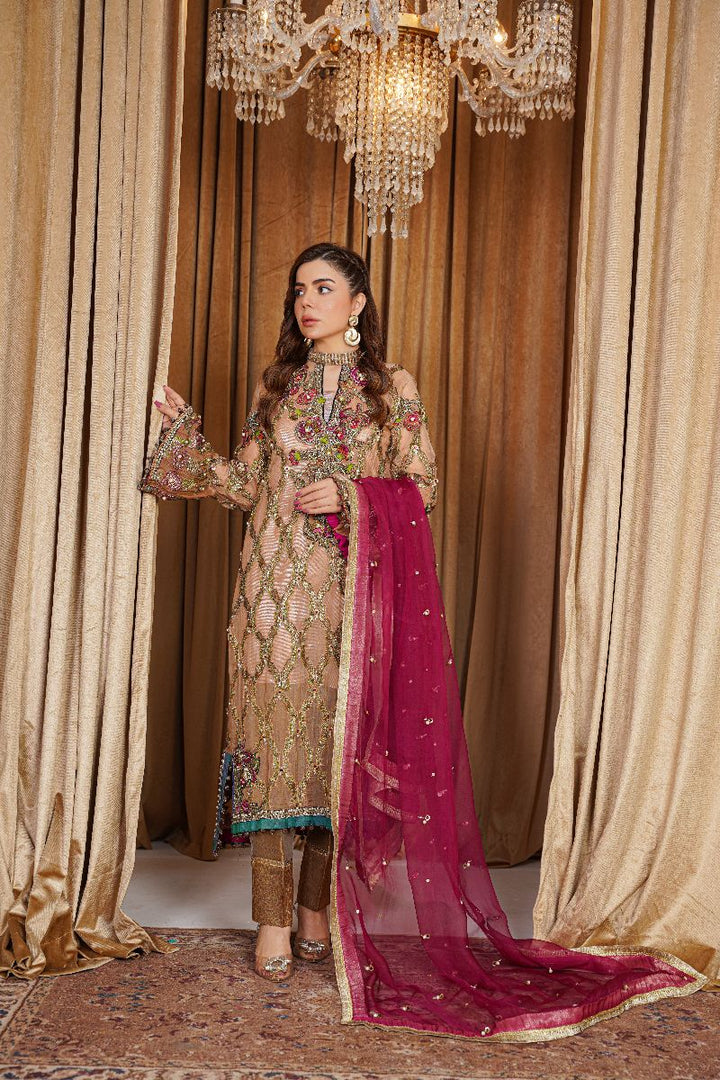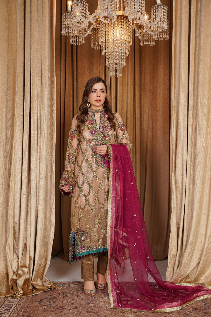 It is paired with gold silk trousers for a sleek and sophisticated finish. Completing the look is a deep maroon organza dupatta, accentuated with light spray work and a finely finished golden border — creating a perfect balance of elegance and allure.