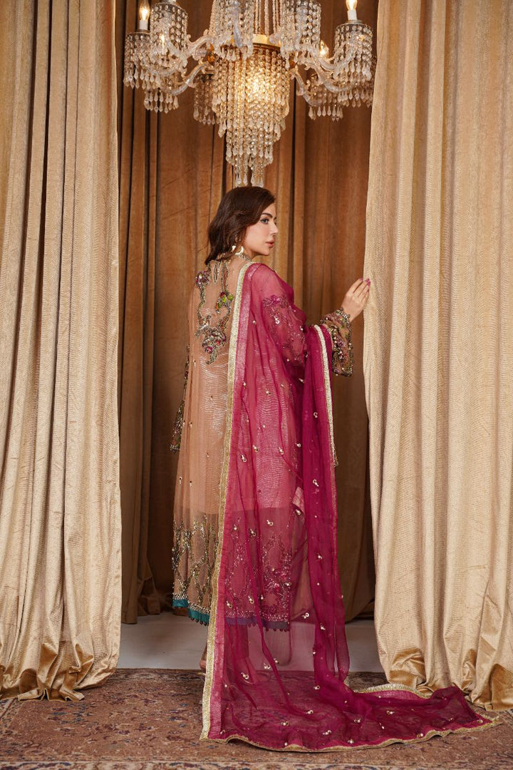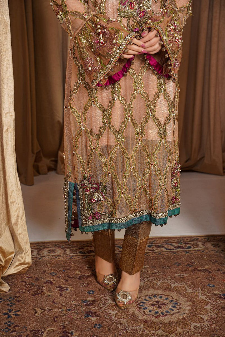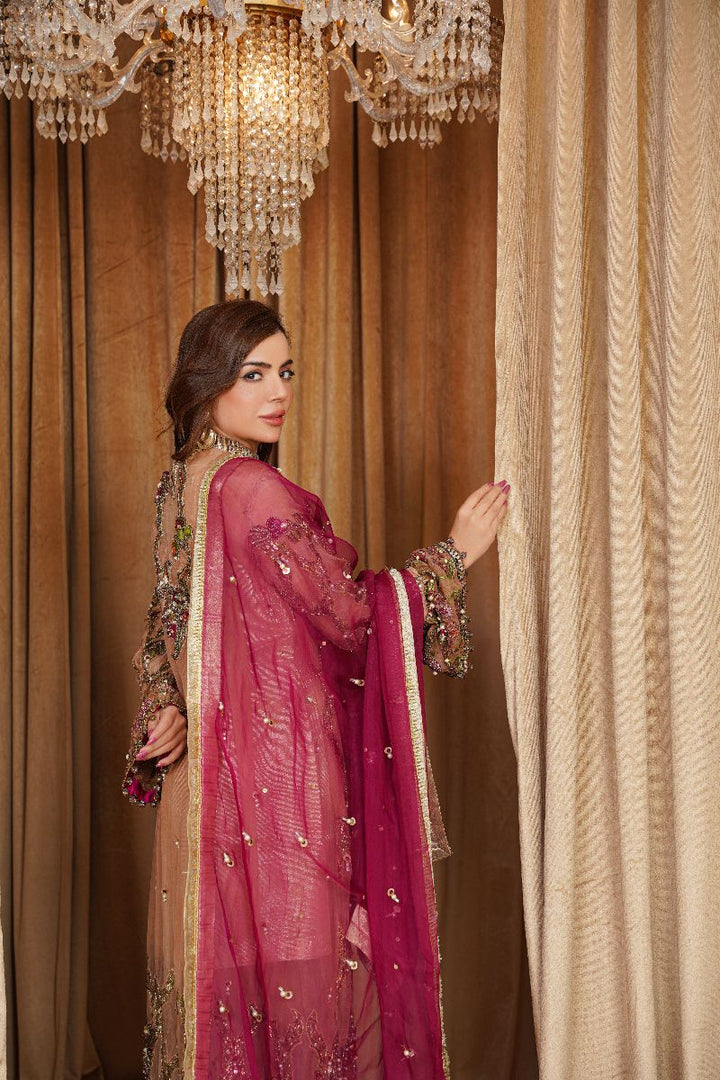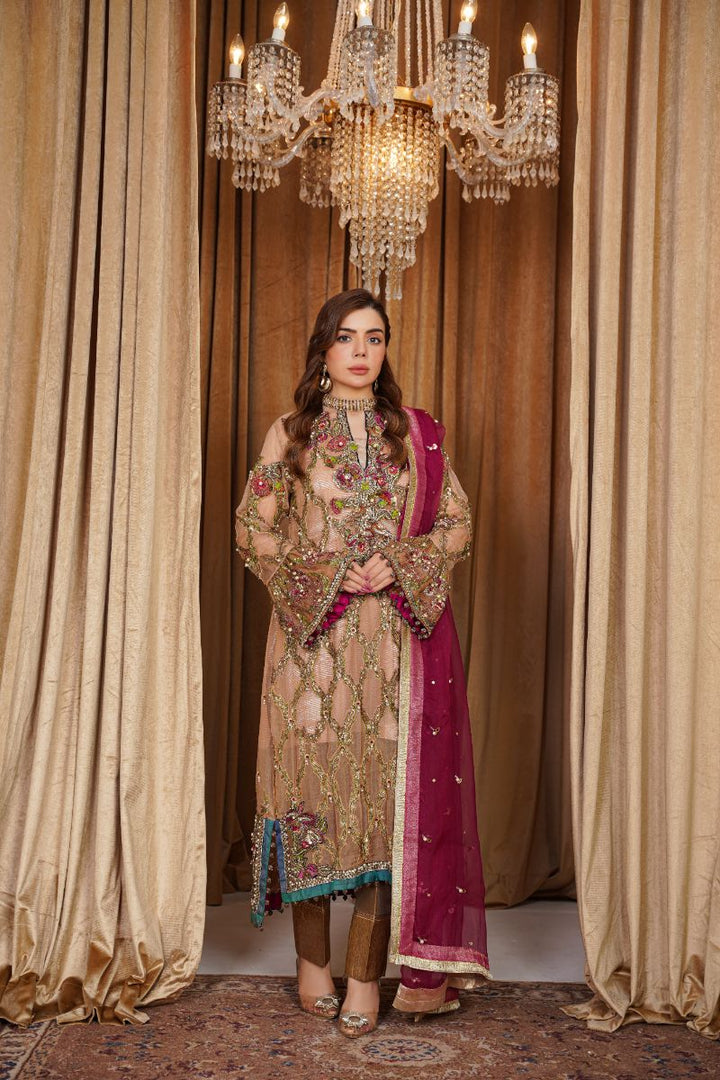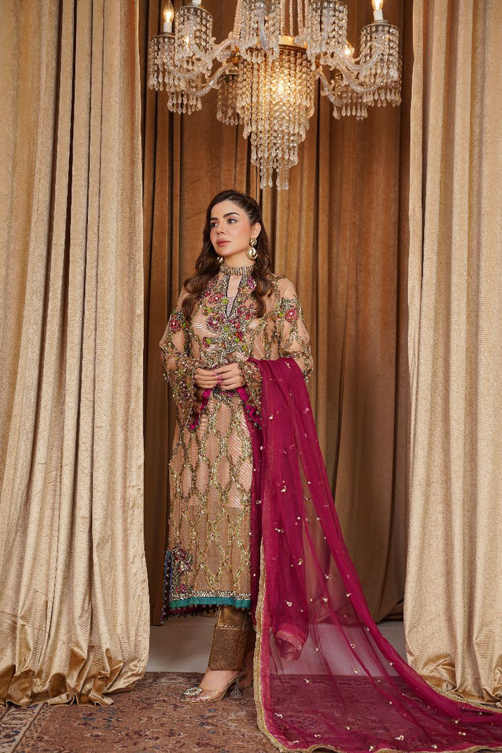 It is paired with gold silk trousers for a sleek and sophisticated finish. Completing the look is a deep maroon organza dupatta, accentuated with light spray work and a finely finished golden border — creating a perfect balance of elegance and allure.