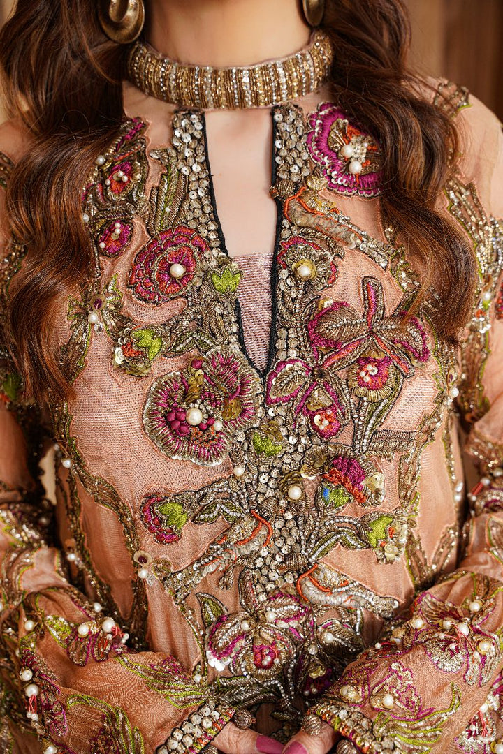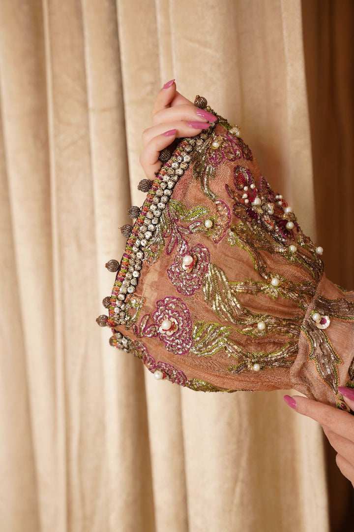 Exude timeless elegance in this exquisitely designed ensemble featuring a luxurious champagne gold organza shirt adorned with intricate hand embroidery, sequins, and bead embellishments in hues of pink, maroon, and green. The rich detailing on the neckline and sleeves enhances its regal appeal, while the subtle shimmer of the fabric adds a graceful charm.