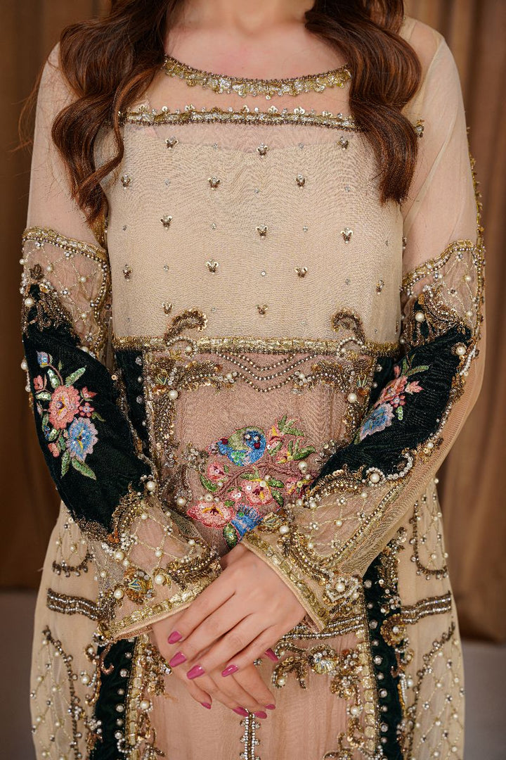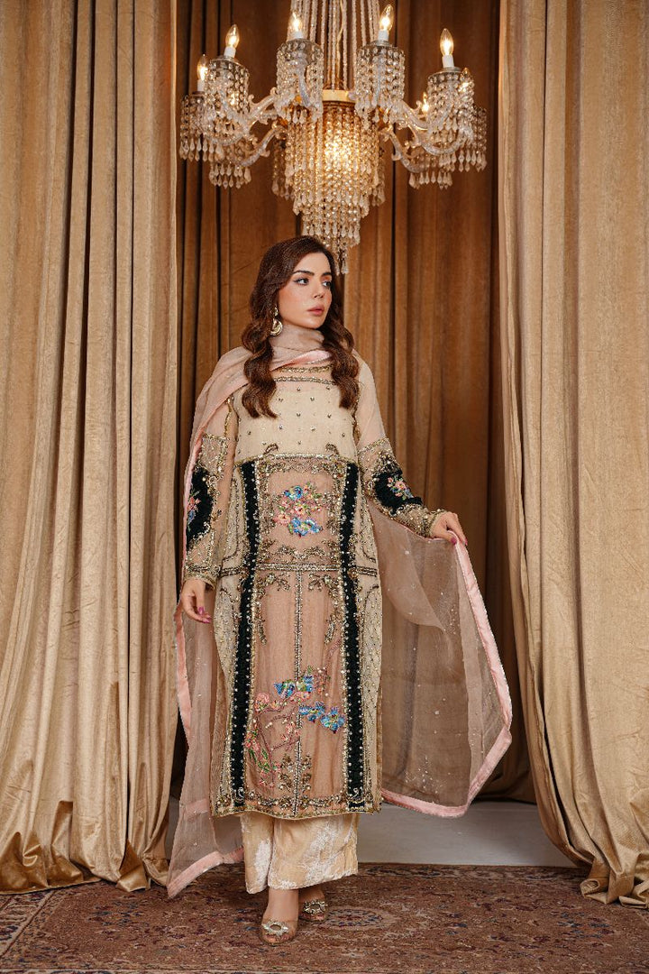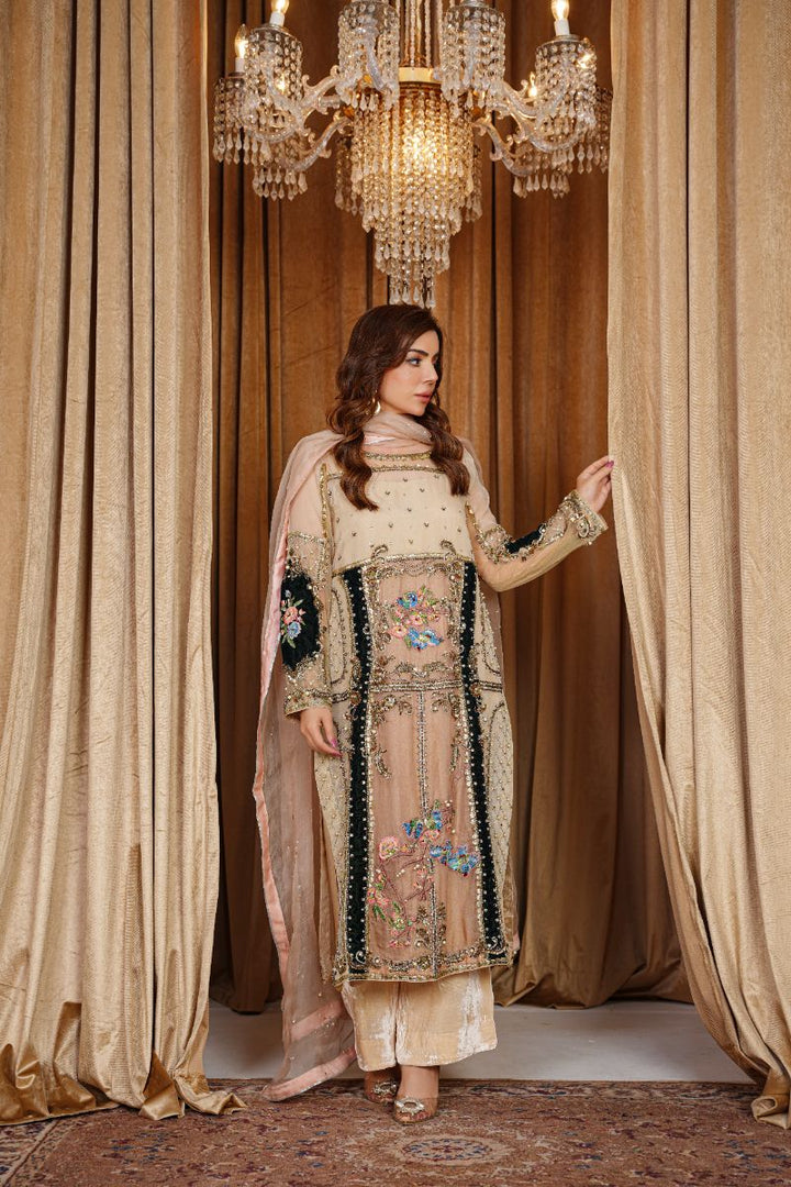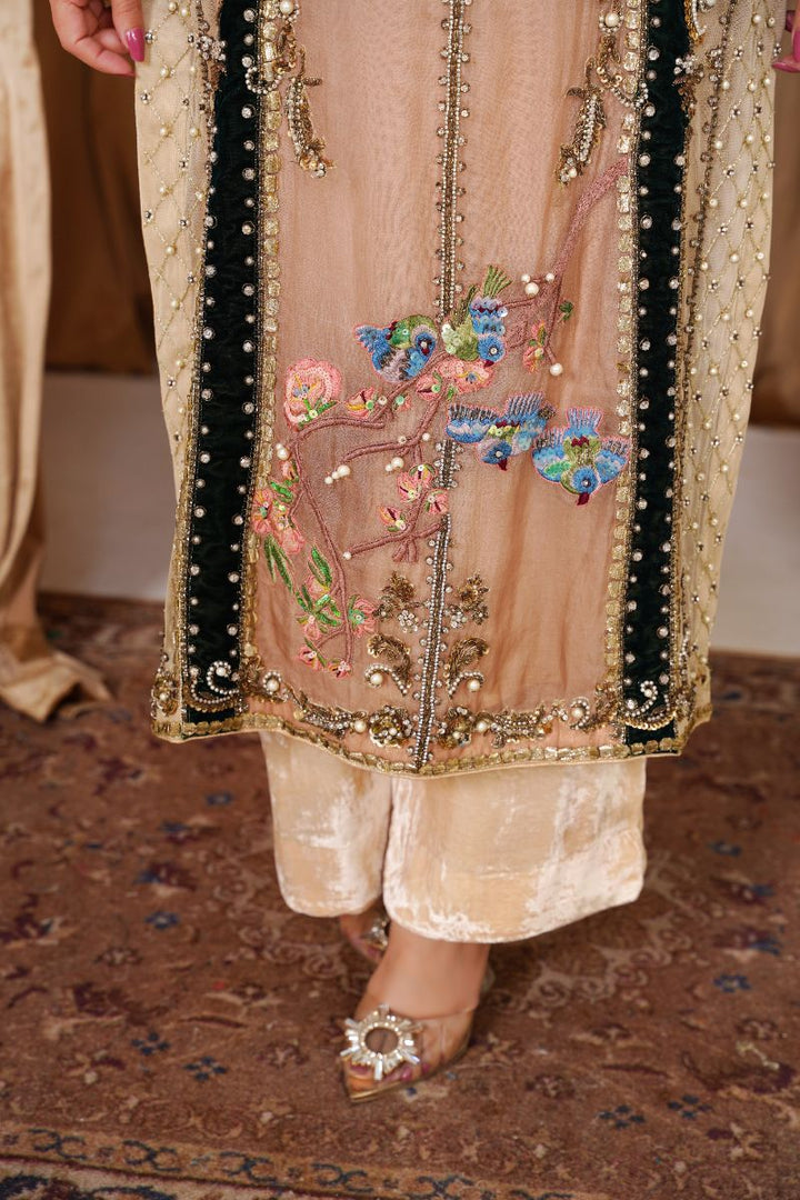 A statement of refined elegance, this ensemble features a champagne organza and velvet shirt beautifully adorned with intricate embroidery, beadwork, and embellishments in tones of blue, gold, and green. The luxurious mix of sheer organza and soft velvet creates a perfect harmony of grace and sophistication, making it ideal for festive and formal occasions.