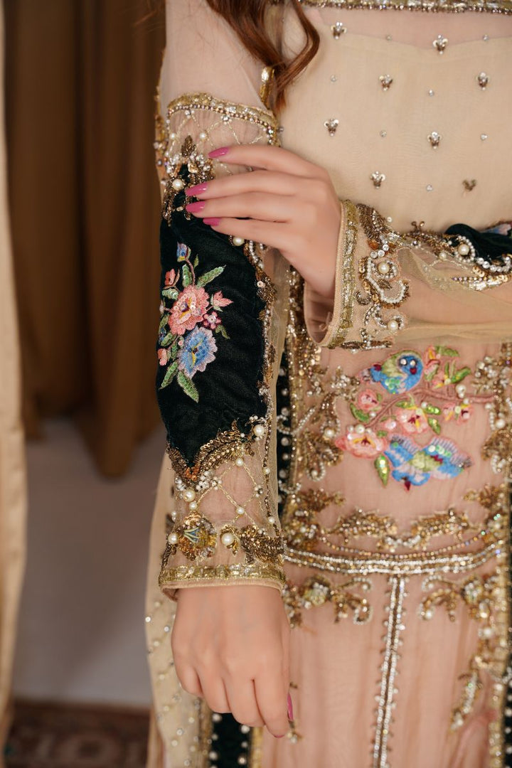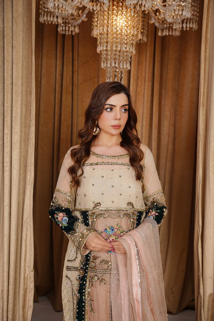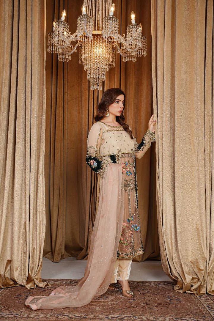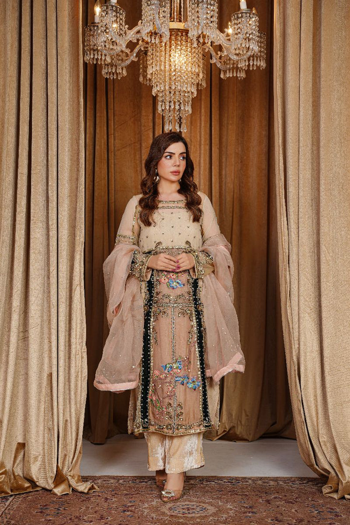 It is paired with champagne velvet trousers that complement the shirt perfectly, adding a subtle yet regal touch. The look is completed with a light champagne organza dupatta, delicately finished with spray work and a fine border for an elegant, timeless appeal.