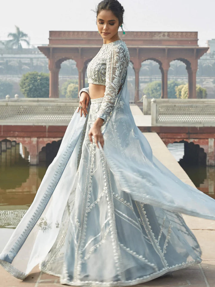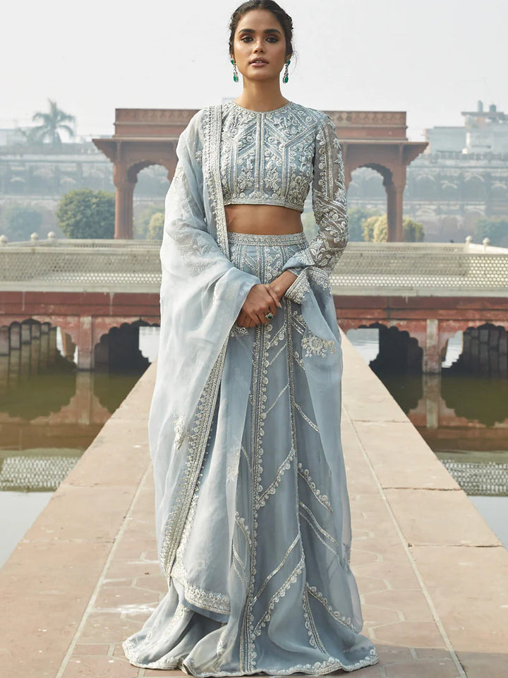 This choli features botanical imageries inspired by adornments of Mughal royalty. The striking work combines meticulous zardozi embroidery with hints of resham. Paired with an organza lehnga and heavily embellished dupatta for timeless appeal.