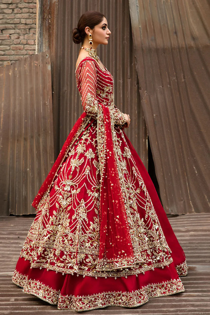 Draped in a tapestry of dreams, this red bridal attire is a testament to the artistry of hand embellishments.