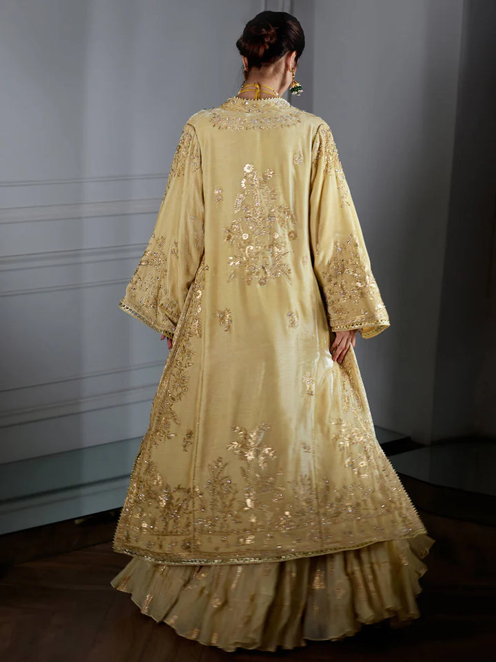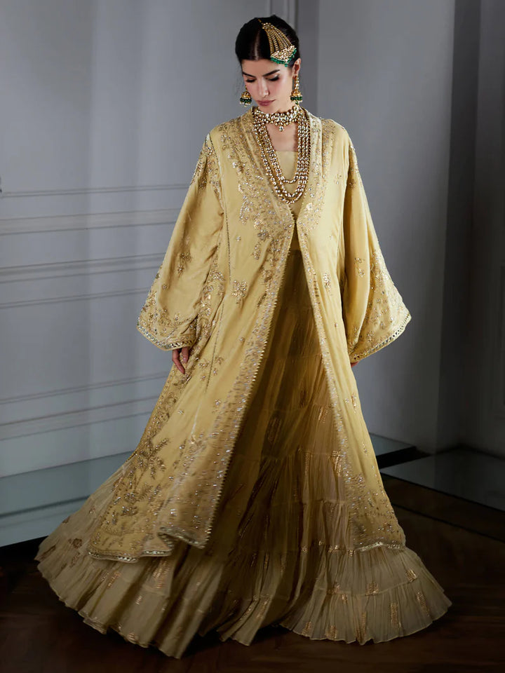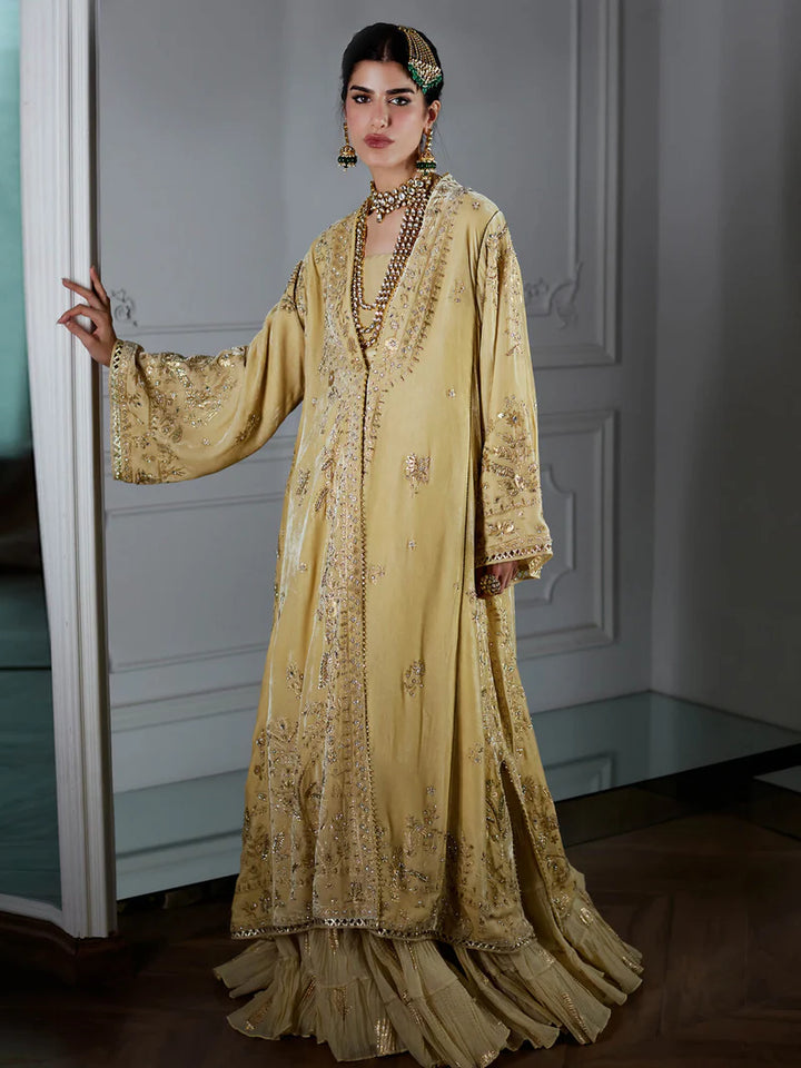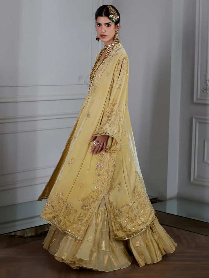 The Chogha exudes effortless glamour for the modern woman. Crafted from sand velvet, it features foil print with zardozi work, showcasing chintz and Mughal floral motifs and is paired with a raw silk top and a crushed ghagra. Perfect for wedding celebrations and glamorous festivities.