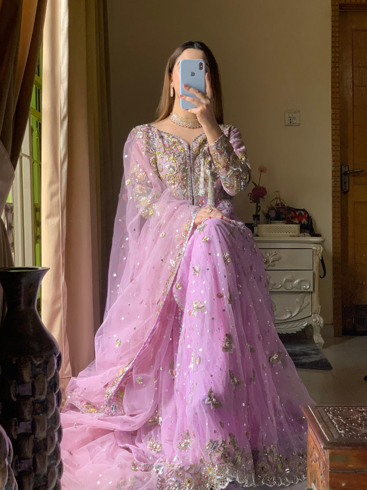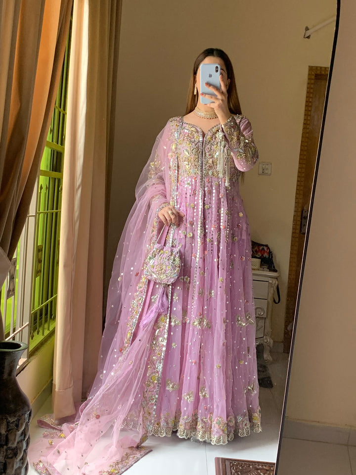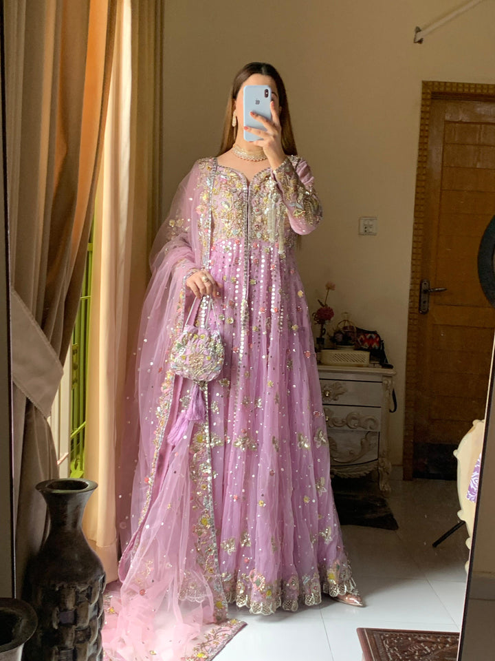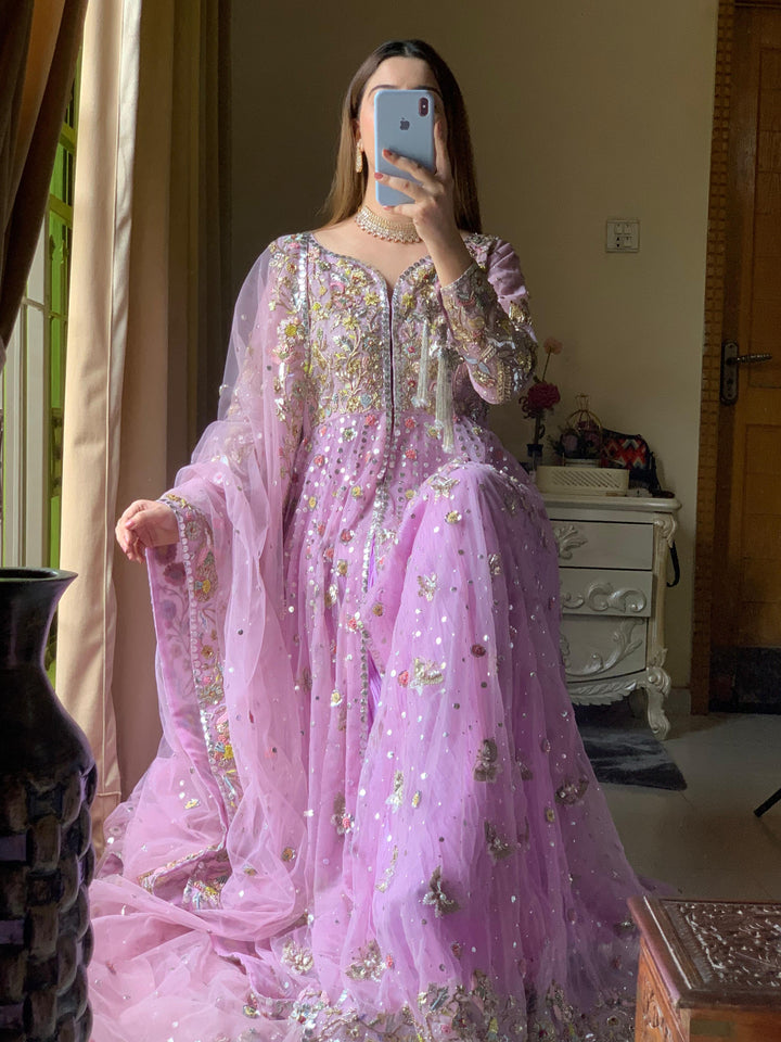 Our gorgeous client looks absolutely stunning in this pastel lilac outfit. The ensemble features intricate hand embroidery on net fabric paired with a beautifully embellished dupatta. The soft hue and detailed craftsmanship create an elegant, timeless look — perfect for festive or wedding occasions.