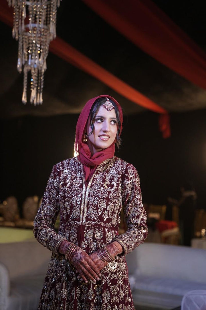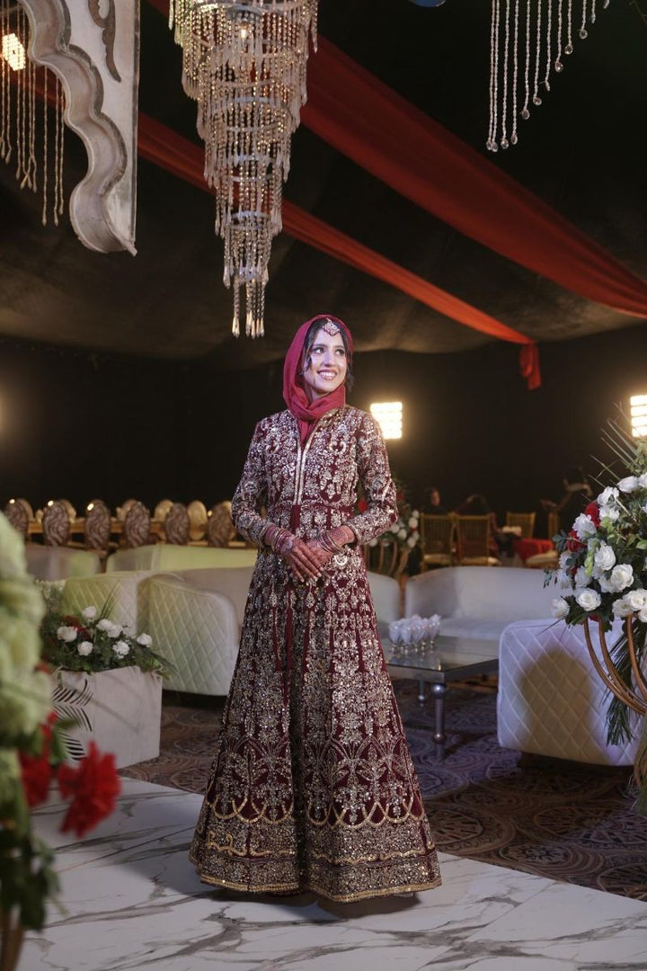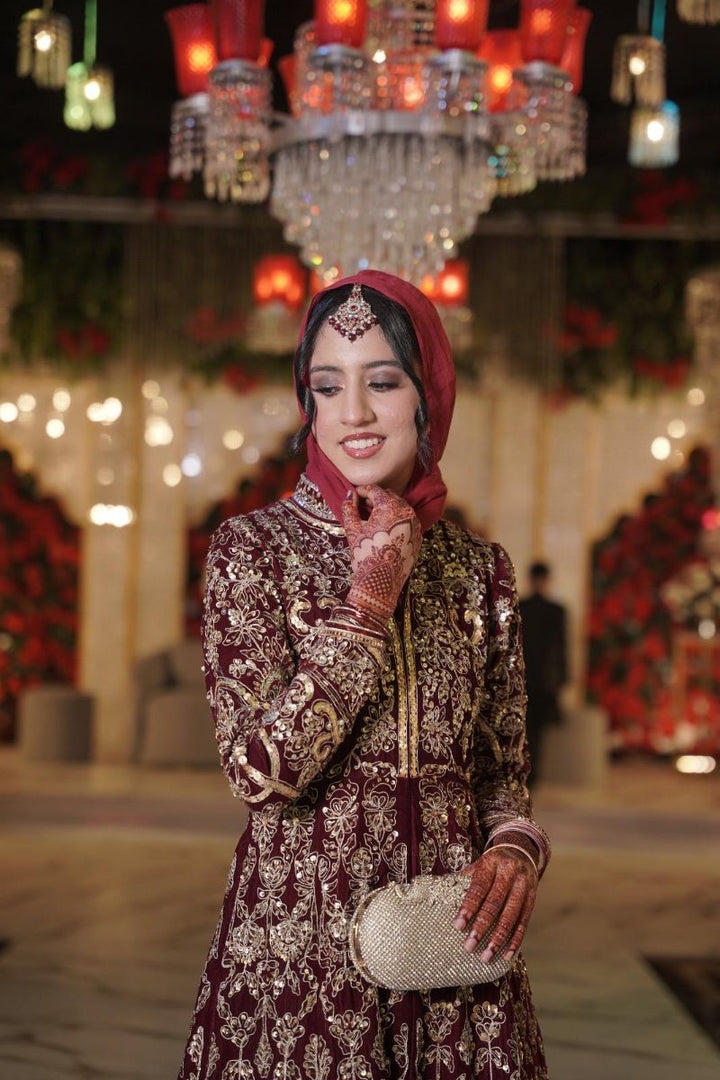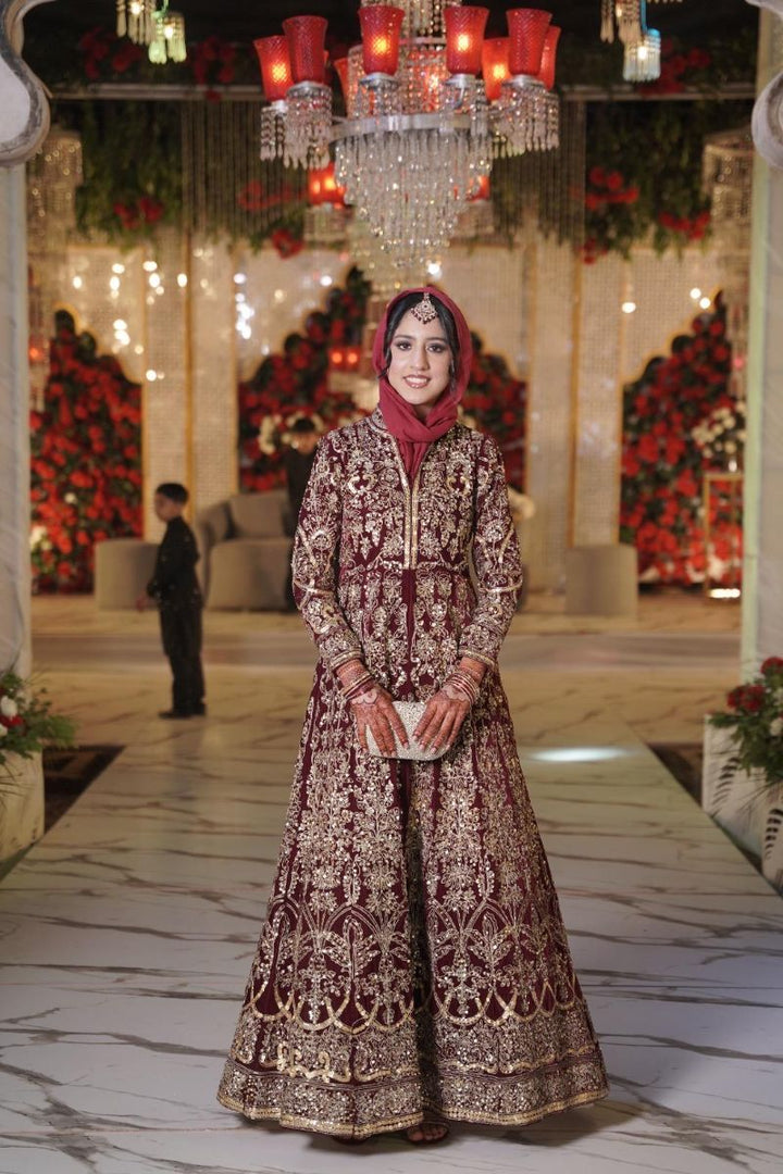 Our gorgeous client radiates elegance in this deep maroon velvet ensemble, beautifully adorned with intricate golden embroidery. The luxurious fabric and detailed craftsmanship create a regal look, perfect for any festive or bridal occasion.