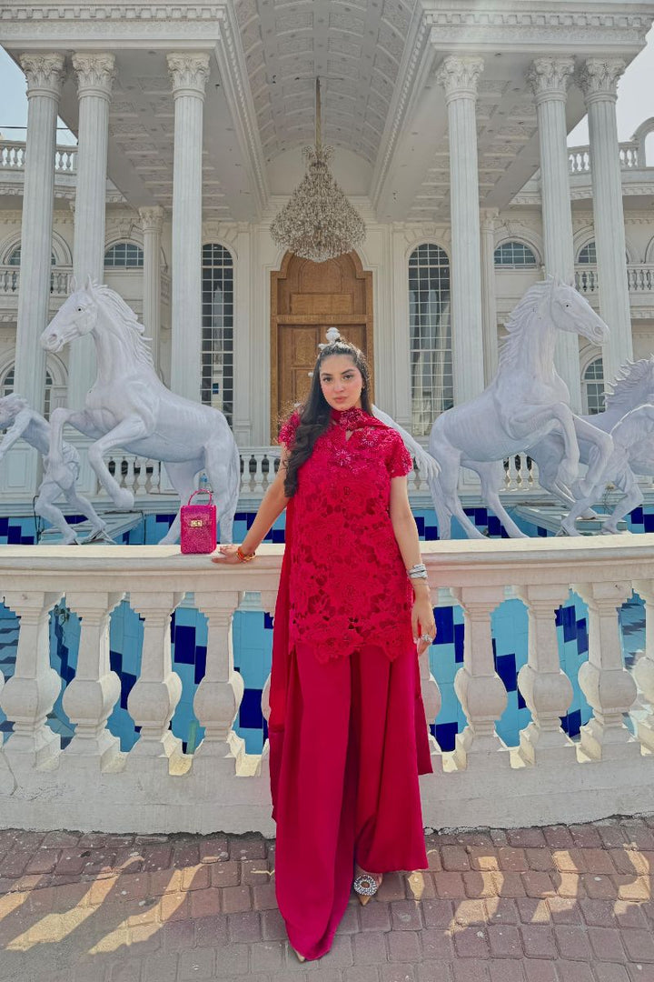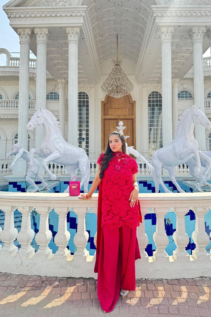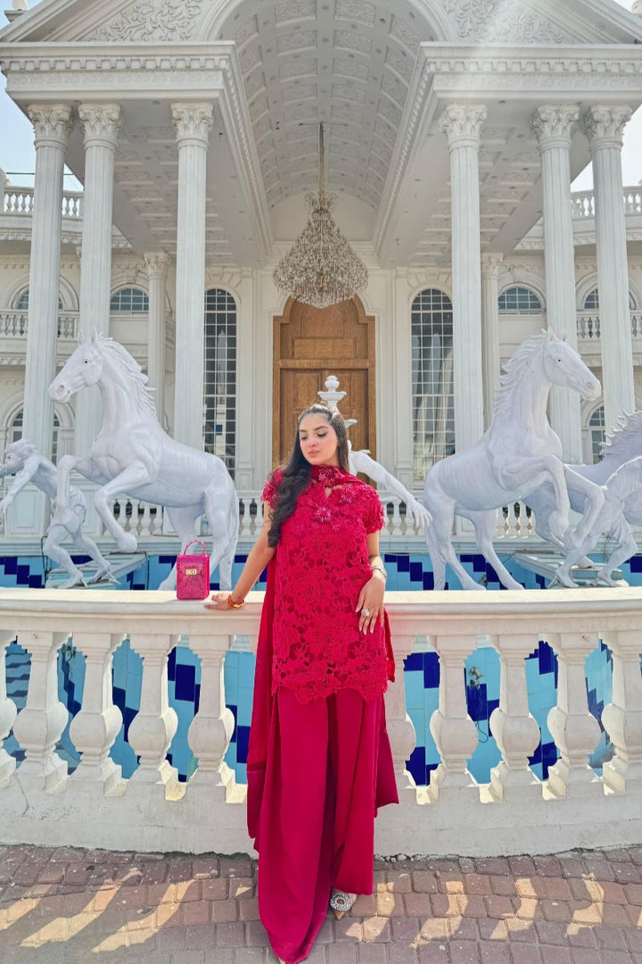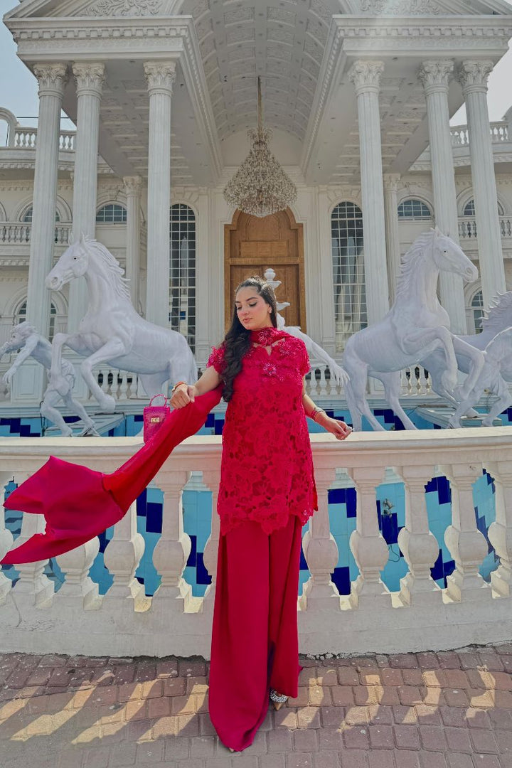 Our beautiful client looks stunning in this deep rose ensemble — a perfect blend of elegance and modern grace. The outfit features an intricately embroidered lace top paired with flowy trousers, creating a statement look that’s both chic and timeless. ✨