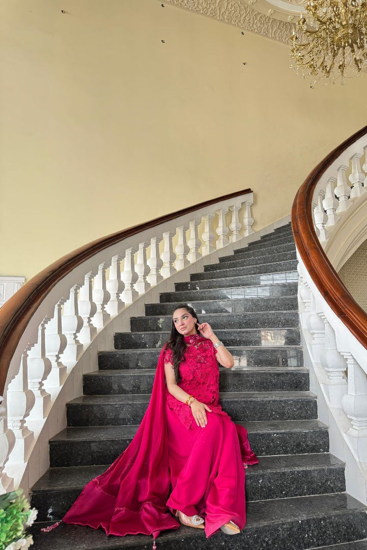 Client TestimonialOur beautiful client looks stunning in this deep rose ensemble — a perfect blend of elegance and modern grace. The outfit features an intricately embroidered lace top paired with flowy...