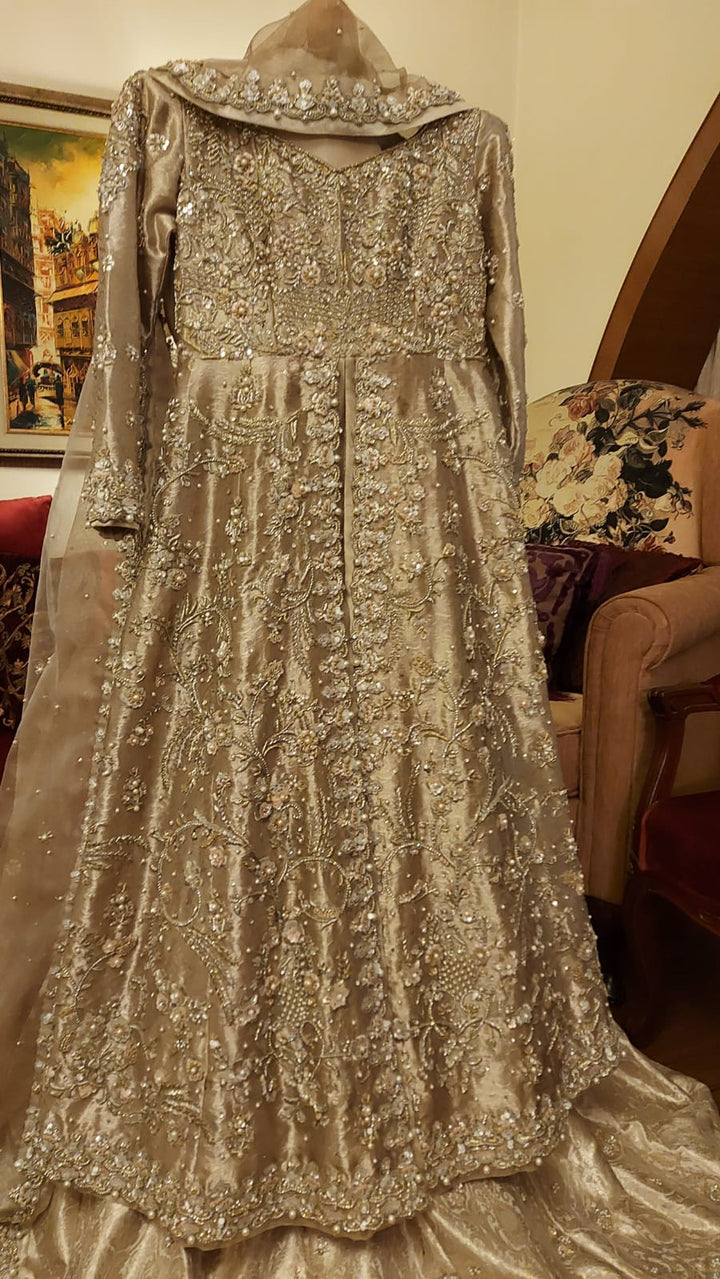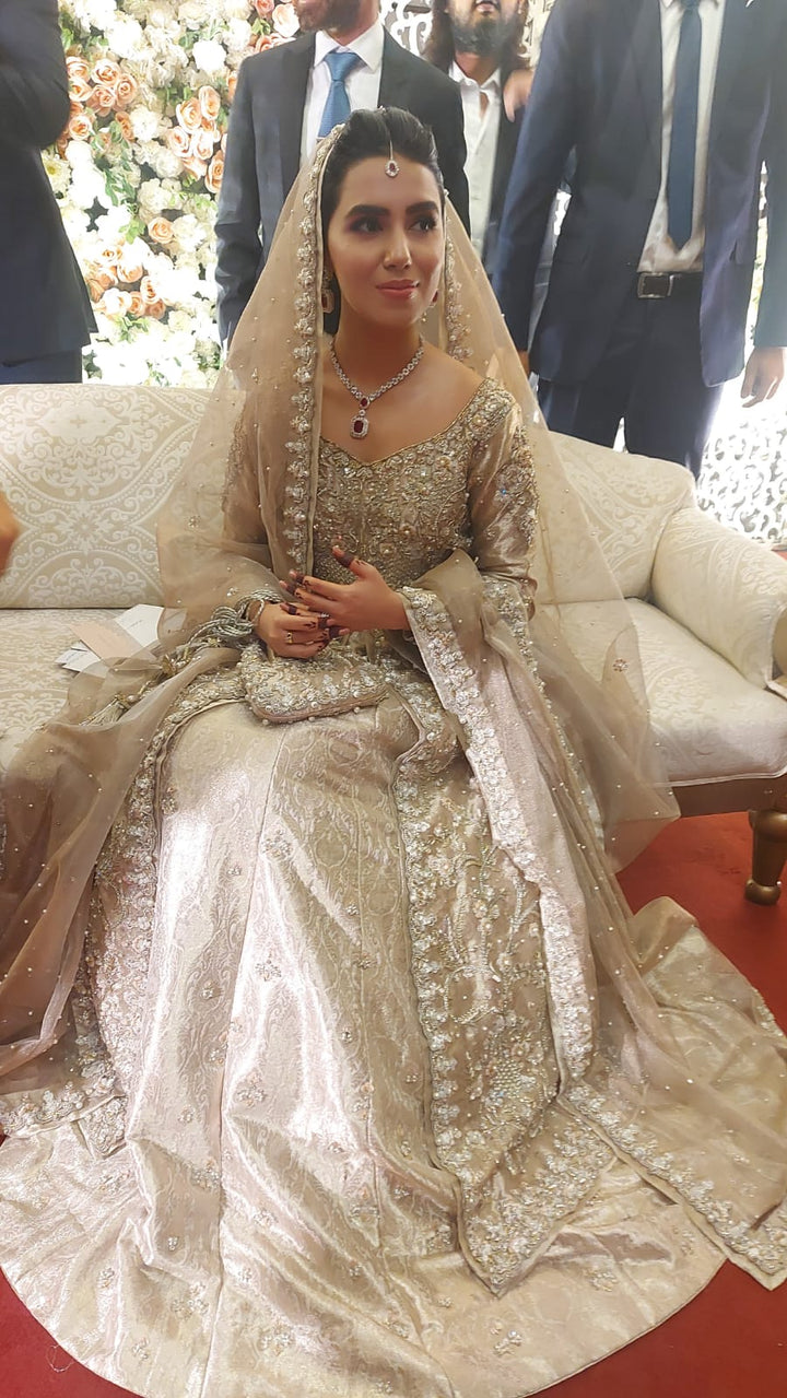 This breathtaking champagne gold bridal ensemble blends tradition with modern grace. The outfit features a tissue shirt adorned with intricate hand embroidery, pearls, sequins, and crystal embellishments, creating a luminous and regal look.