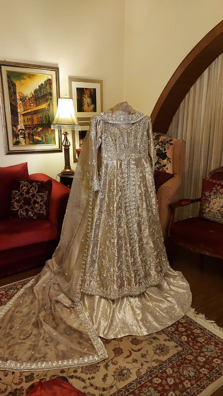 This breathtaking champagne gold bridal ensemble blends tradition with modern grace. The outfit features a tissue shirt adorned with intricate hand embroidery, pearls, sequins, and crystal embellishments, creating a luminous and...