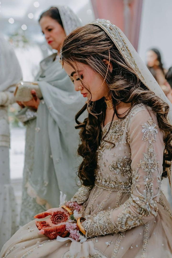 β¨ Style: Heavily embellished long gown paired with raw silk lehnga