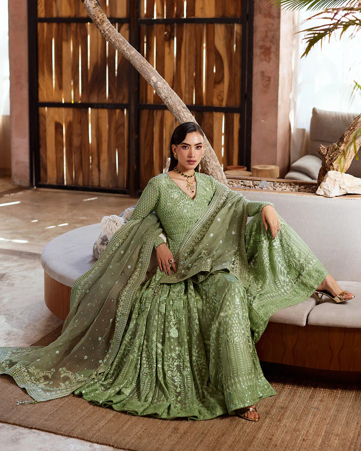 Crafted in a classic pishwas silhouette, Eiraam radiates vintage opulence. The sage green chiffon canvas features an intricate web of resham and sequins. This set is paired with an organza dupatta...