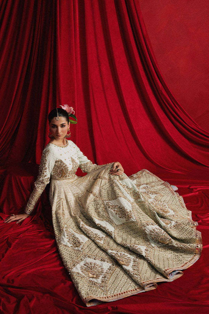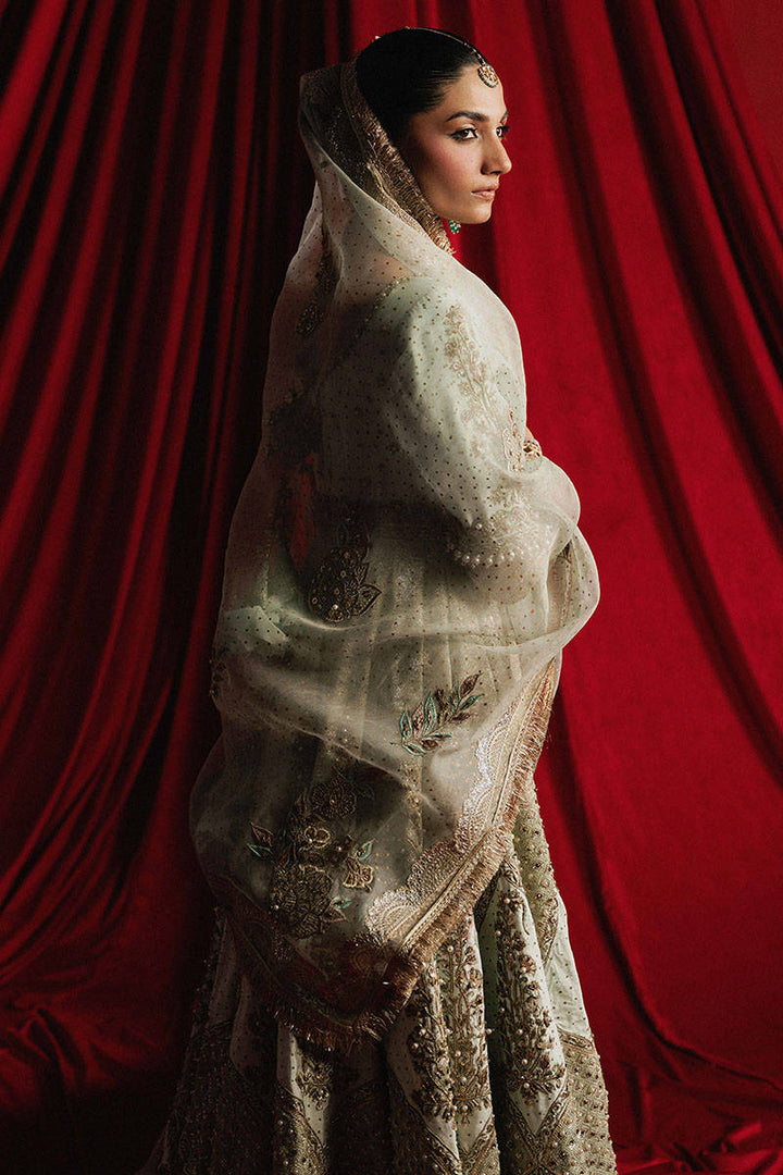 Gulé Jaan is dipped in the pale luminescence of icy blue Indian silk. The choli, long-sleeved with a graceful boat neckline, features a double-sleeve illusion and subtle structure, embroidered in golden thread with twinkling pearls that dangle at the cuffs like icicles on a window ledge. The lehenga is composed of angular silk appliqué panels stitched together like stained glass, each one enclosing a peacock motif picked out in sequins and zari. Across the expanse, palmette-shaped borders stretch in angular symmetry, embroidered in fine gold thread, leading to a finely decorated hemline that sparkles like snow caught in twilight. The organza dupatta, light as a frost-kissed breeze, is embroidered with soft flowers in silken and metallic threads, framed with a scalloped internal border and edged in traditional golden kiran