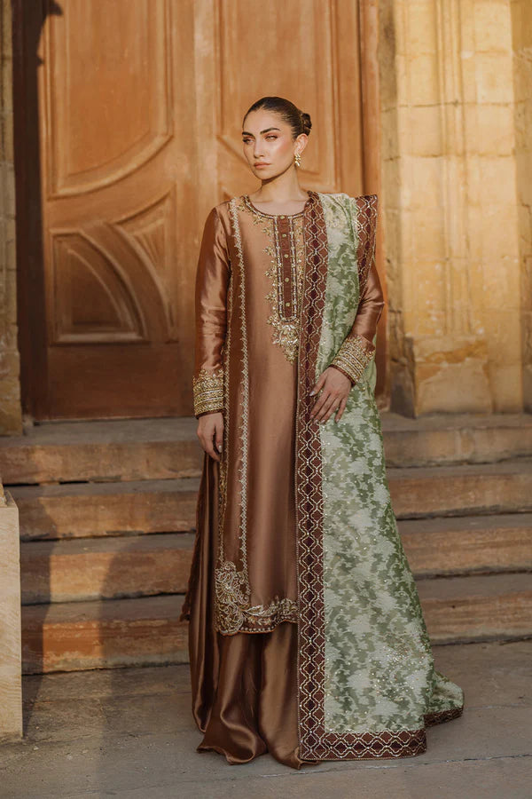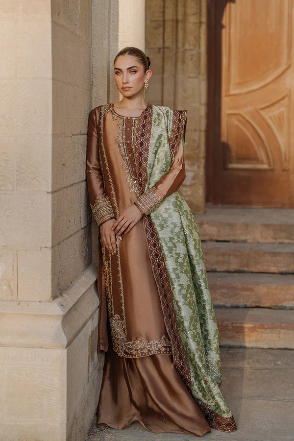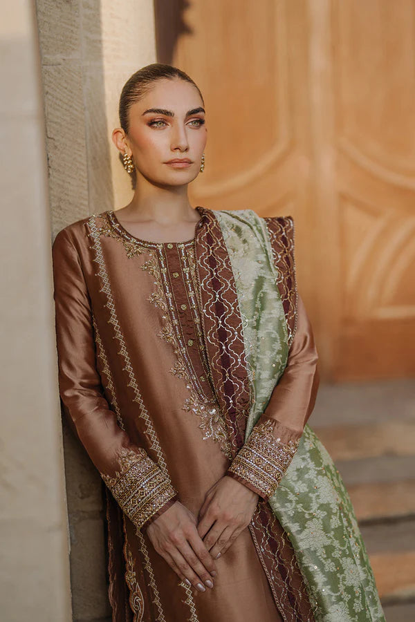 This luxurious self-jamawar shawl features velvet and gotta finishing with intricate cut dana, dhanak, sequins, tiki stone, zari, naqshi, and gotta detailing, offering a timeless blend of elegance and craftsmanship.This exquisite green jacquard zari net shawl from our Festive Formal Collection is a masterpiece of elegance and intricate craftsmanship. The luxurious fabric is adorned with delicate hammer work and a soft sequence spray that adds a hint of sparkle. Beautiful applicatuib kamdani detailing and tiki stone accents bring a refined texture, creating a perfect blend of traditional artistry and modern sophistication. This shawl is a stunning statement piece, ideal for elevating any outfit with its rich detailing and timeless appeal