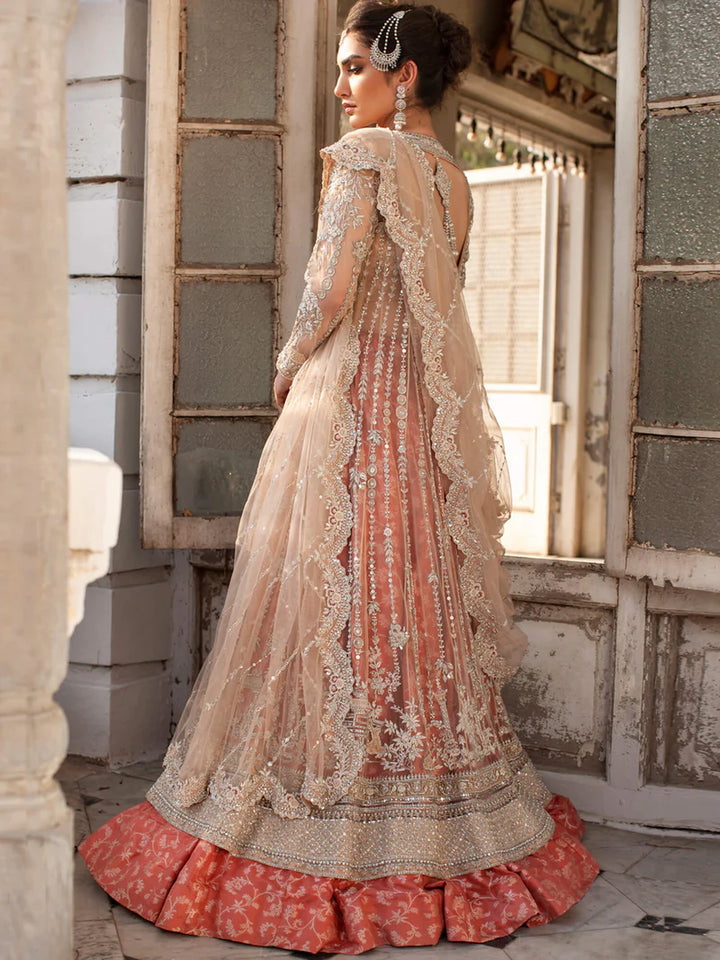 This dream-worthy bridal kalidar comes with a rich coral brocade lehenga and scalloped dupatta. It is crafted using the finest hand-embroidered techniques. Match the drama of this style with your jewels...