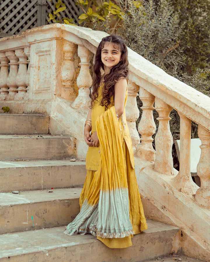 A three piece knee length yellow kameez, embellished artfully to imitate shisha work, paired with a classic crushed sharara and a beautiful tie-dye dupatta.