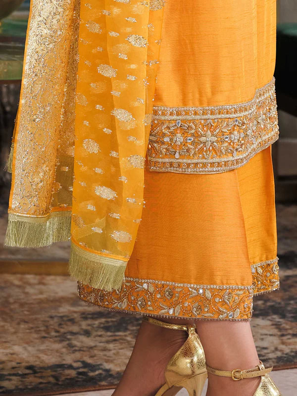 mustard raw silk with handwork (three piece set) This design is customisable Delivery Time:12 days