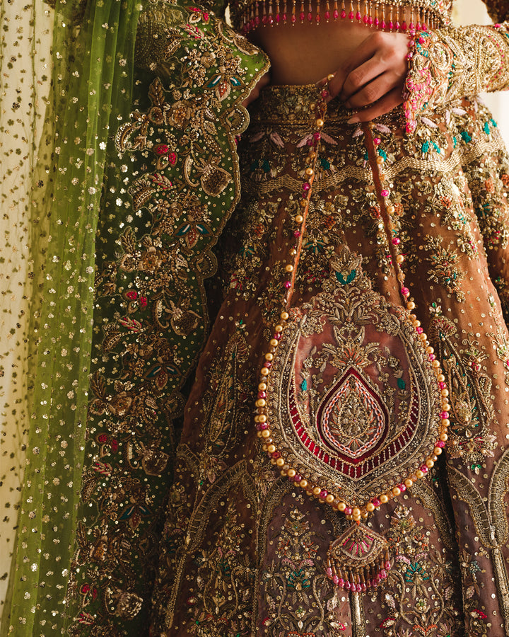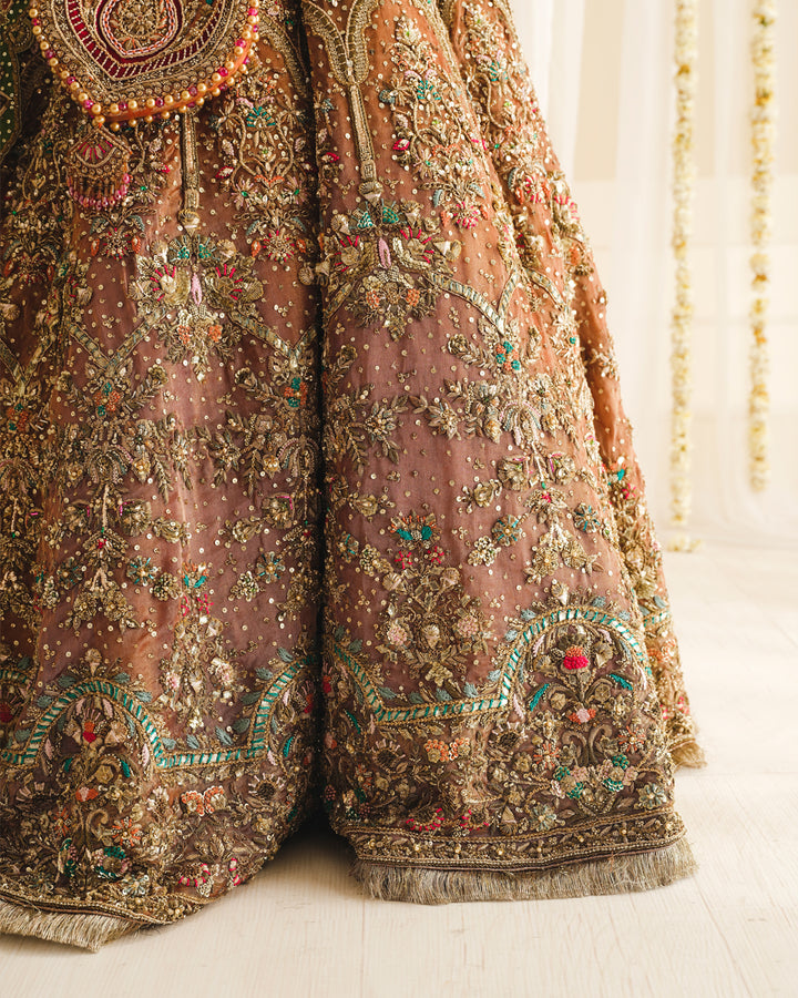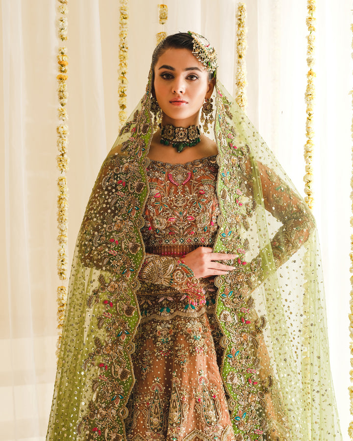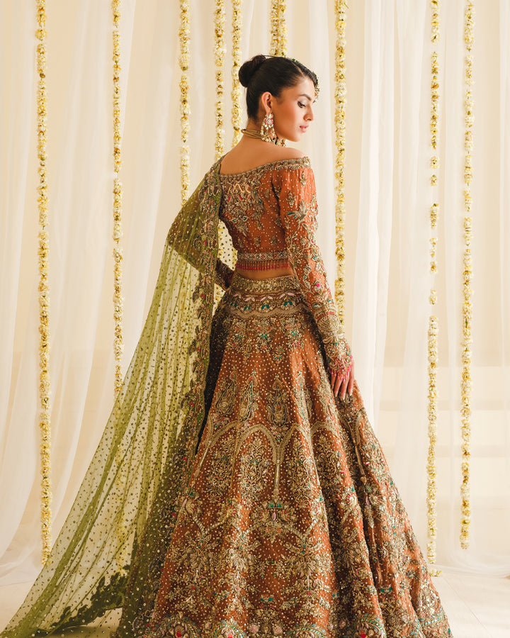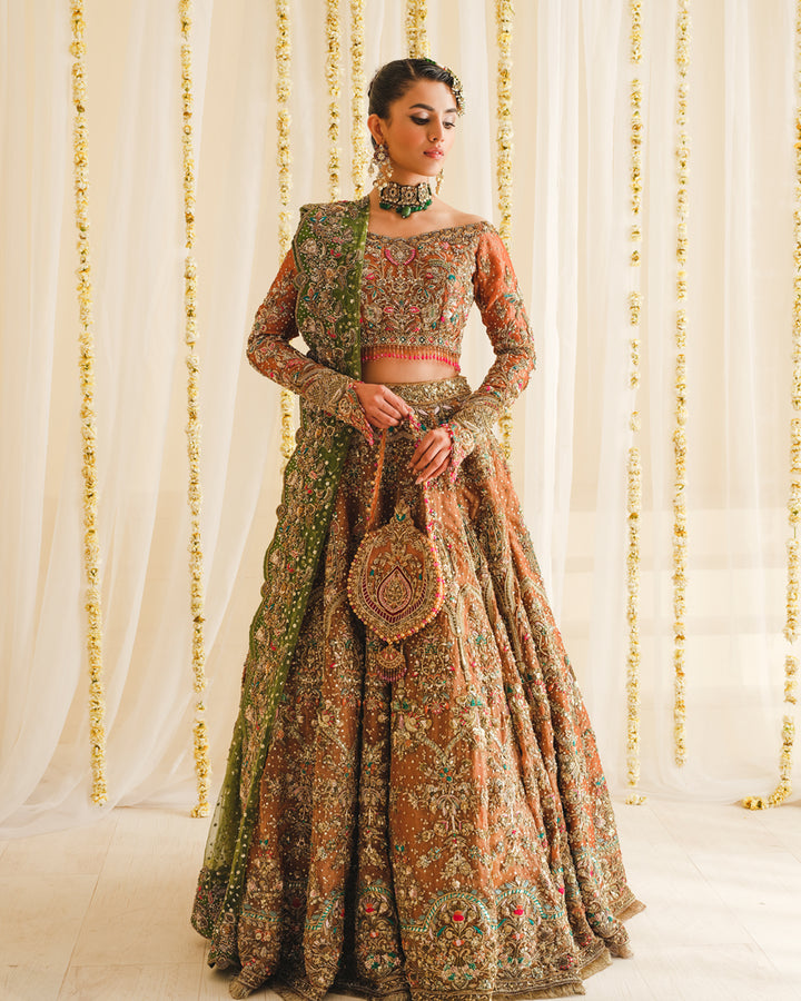 Mahsa🔸a symphony of twilight hues, where burnt orange embers embrace the emerald whispers of dawn. Draped in zarodozi constellations, every thread tells a tale of opulence and grace. For the modern bride, this lehnga is more than an attire—it is a poetic reverie, where fire meets forest, and tradition dances with contemporary elegance ✨