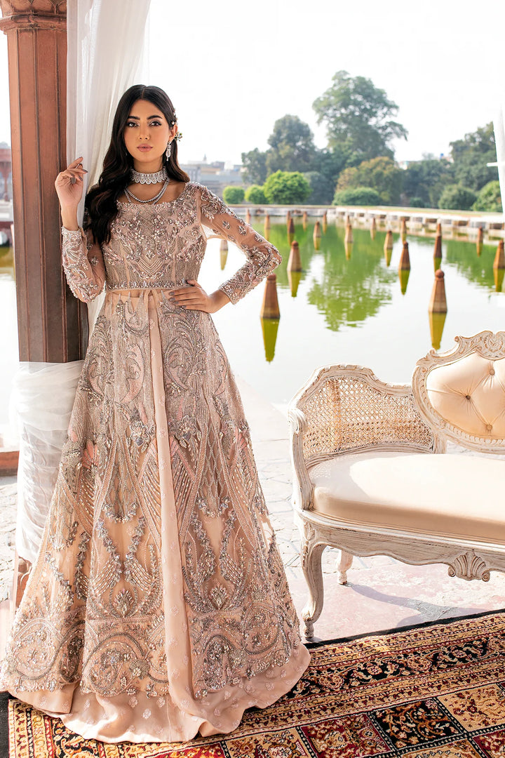 A white net front open flared gown that is heavily embellished in white pearls, crystals and mirror work paired with a silk zari lehnga and heavy net dupatta witg embellishment on...