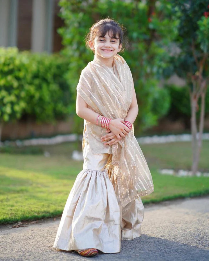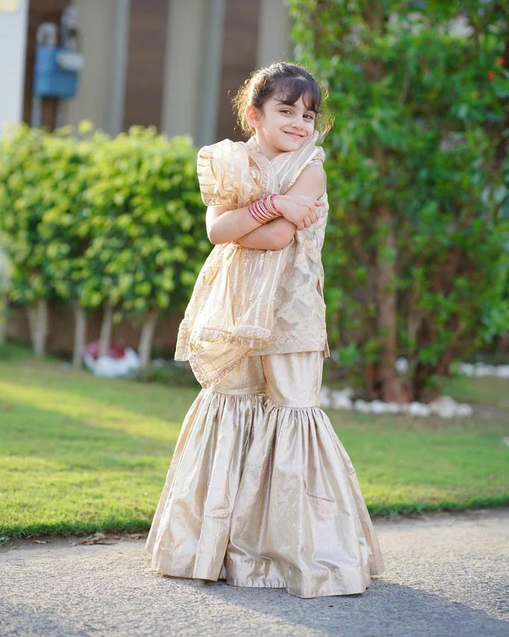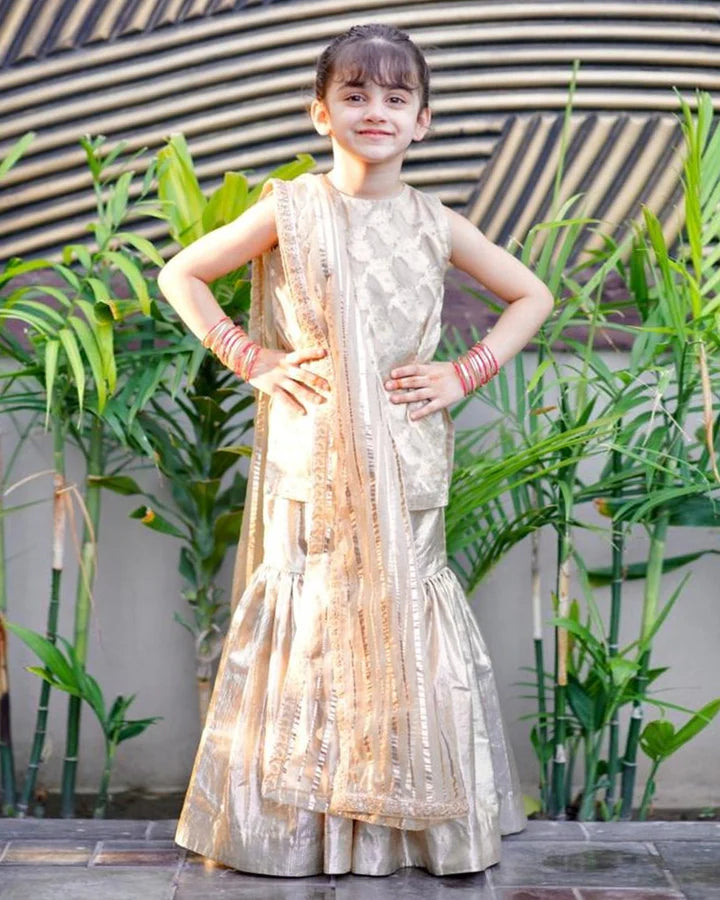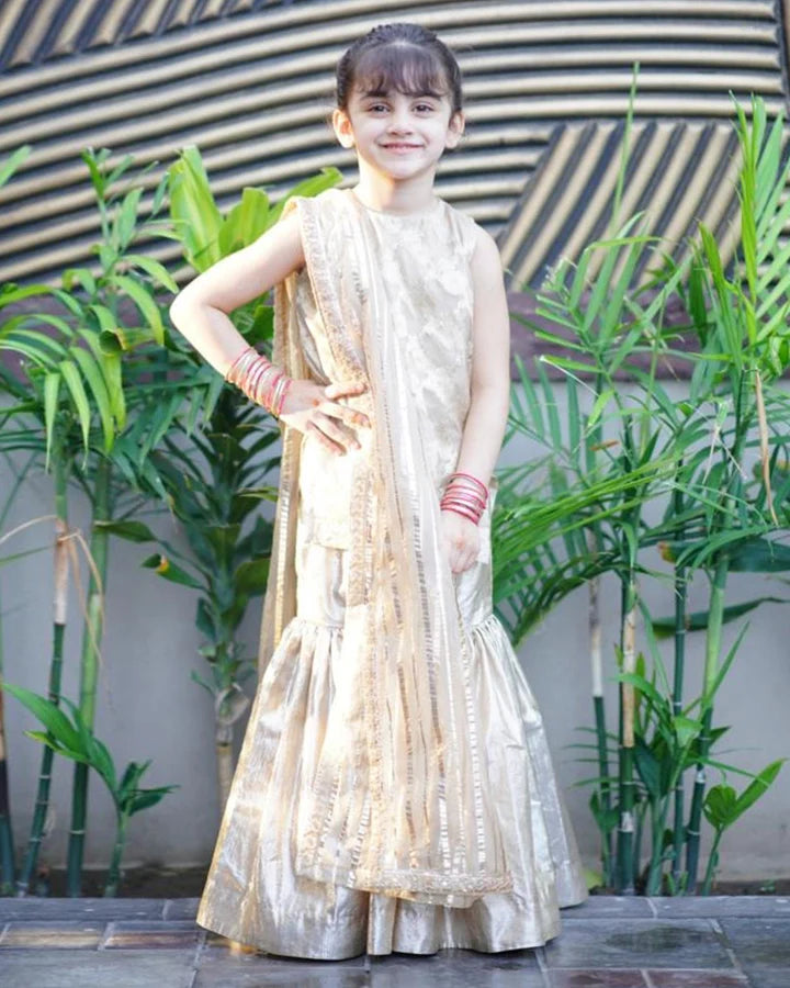 Three piece gold tissue and organza gharara set, featuring glistening embellishments and laces.