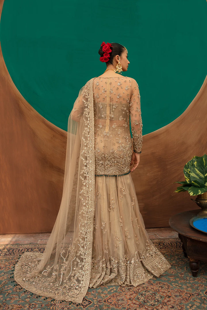 A net short mermaid shirt with gold tissue lining paired with a flared lehnga in the same color and fabric. This ensemble is embellished beautifully in gold material consisting of sitara, salma, sequence and gold crystals. The dupatta is in gold net with embellished and embroidered border and motif spray in the middle.