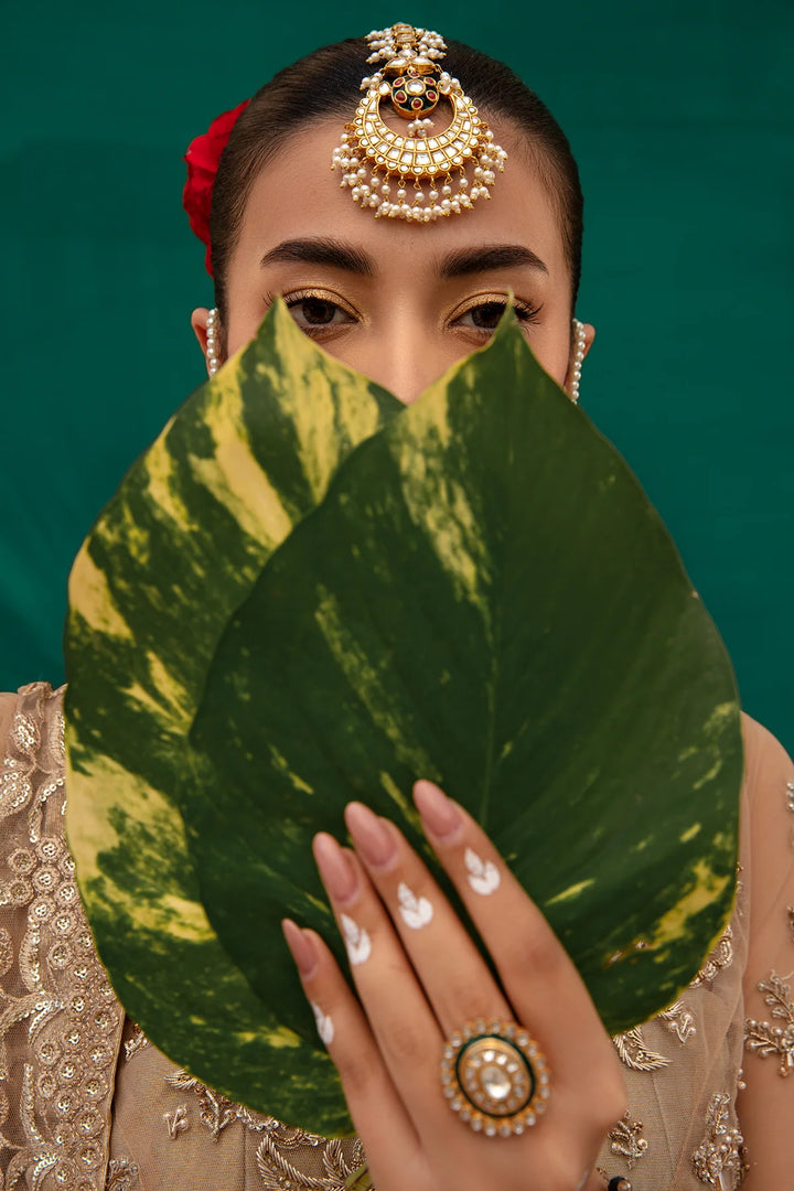 A net short mermaid shirt with gold tissue lining paired with a flared lehnga in the same color and fabric. This ensemble is embellished beautifully in gold material consisting of sitara,...
