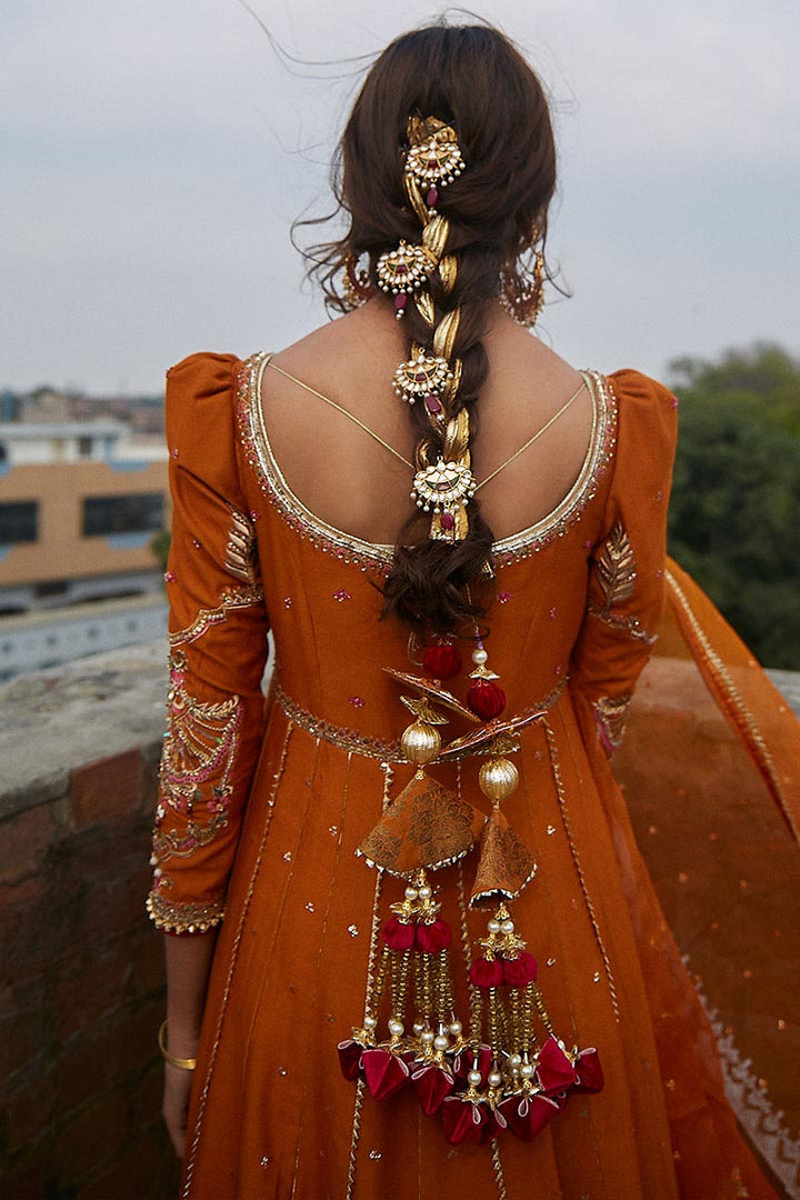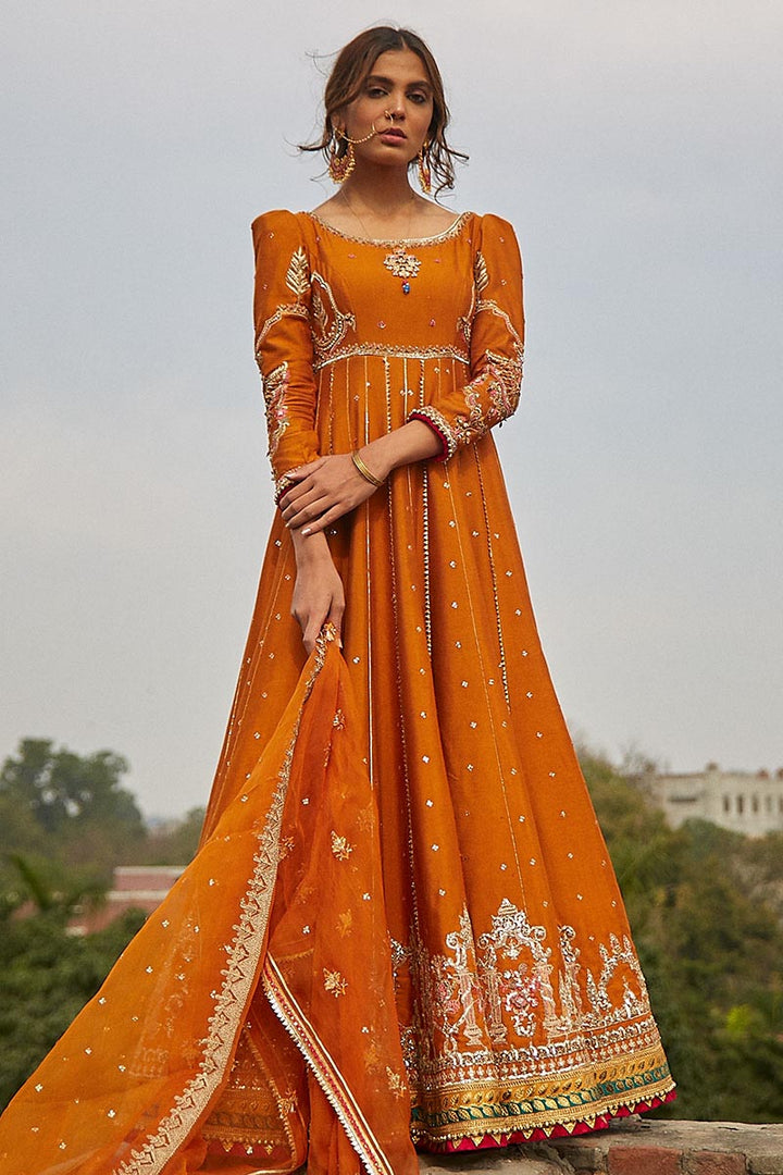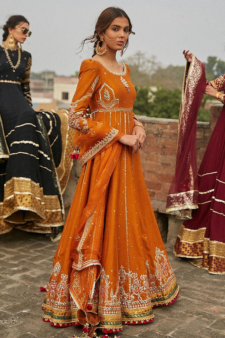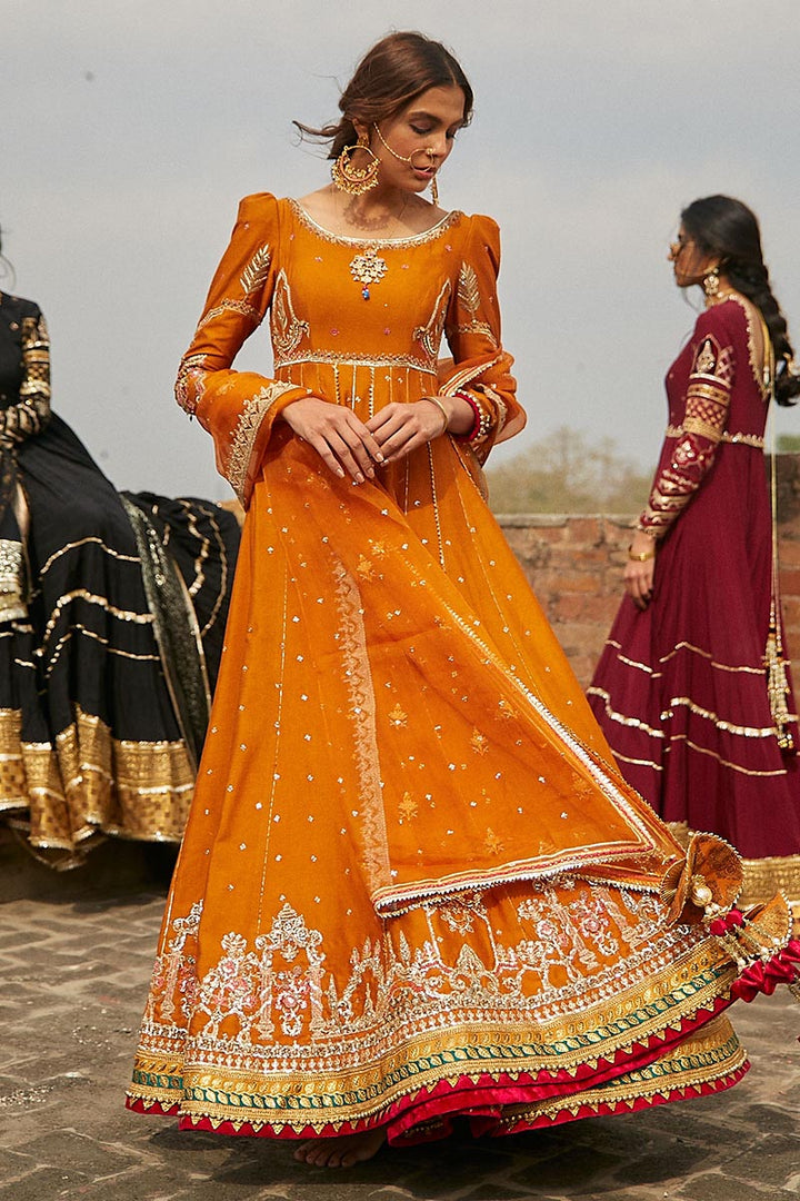 Naazgul of Nizampur is vivacious, zesty and vibrant. A marigold orange kalidaar with puffed shoulders with a heavy ghair makes up this royal ensemble. The accents of fuschia in the finishing adds a whimsical touch of modernity and playfulness to this timeless attire. The look is complete with a organza dupata decorated with tilla marori borders with our signature tassles and a cotton silk chooridaar.