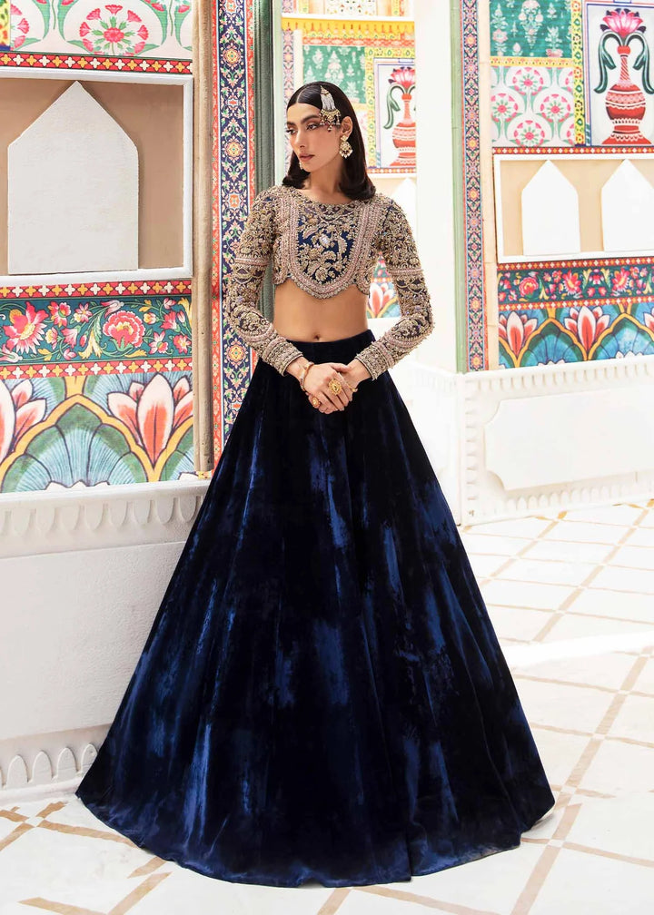 This heavily decorated scalloped choli with velvet lehenga, is quite enchanting. Organza choli's radiant embellishments in a single hue colors and the velvet lehenga's glamorous with organza embellished bodice. This stunning dress with its dreamy flow is a must-have item for the wedding season.