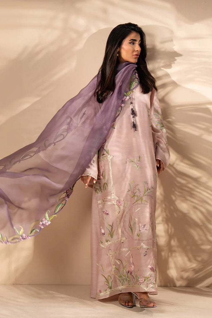 A delicate pink lavender hued kaftan in lustrous khaddi silk serves as a canvas for intricate scenic embroidery. Painterly motifs of flamingos, butterflies and blooming flora rendered in muted rose, pistachio and ivory resham bring the relaxed silhouette to life with quiet elegance. The intricately detailed neckline is finished with beaded tassels for a touch of movement. A cascading deep lilac organza dupatta is edged with eyelet floral borders and pompom details while matching pure raw silk culottes complete the look.