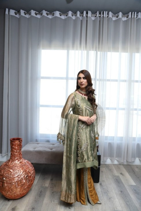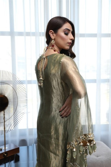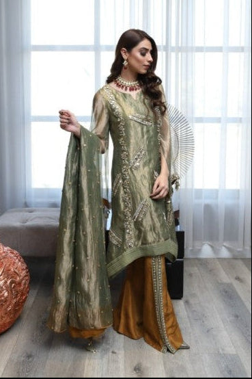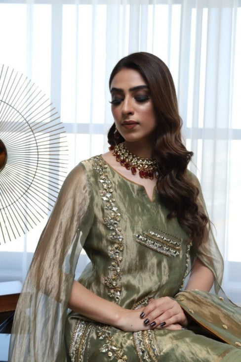 INCLUDES Shirt, bellbottom, Dupatta Colour : Olive Glaze Fabric : Tissue , raw silk An olive green embellished tissue shirt is harmoniously paired with radiant rust pants to make a style statement unlike...