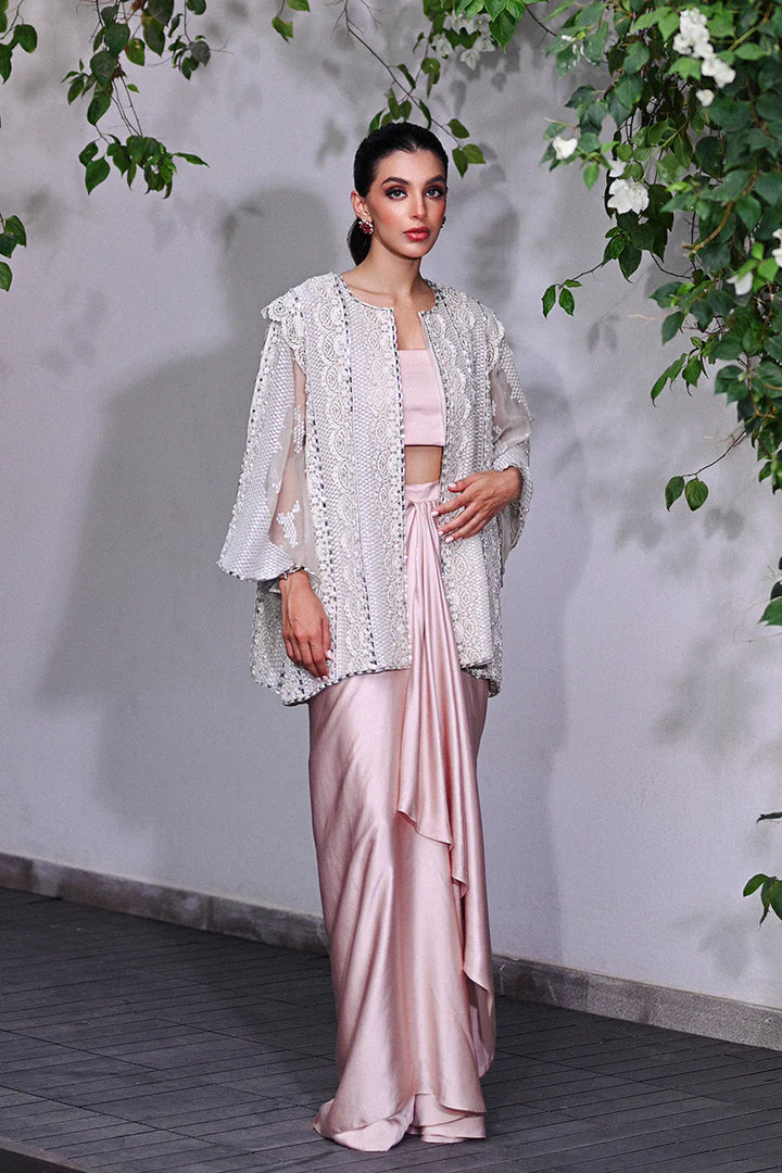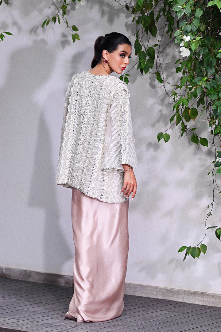Reminiscent of a romantic escape, a statement lace jacket in an ethereal ivory hue drapes over a blush pink charmeuse tube top and waterfall skirt. Silver stones and pearls are meticulously embroidered along the lace panels, illuminating the oversized jacket with its theatrical, flared sleeves.