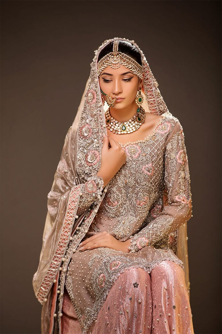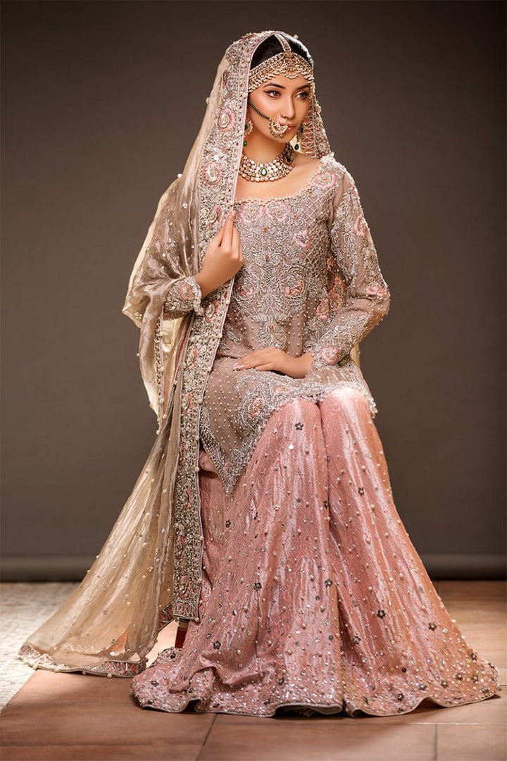This bridal dress has lustrous fabric of nude pink hue sharara embellished with stunning pearls and a heavily cladded shirt paired along heavenly artwork dupatta.