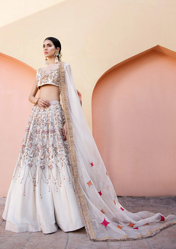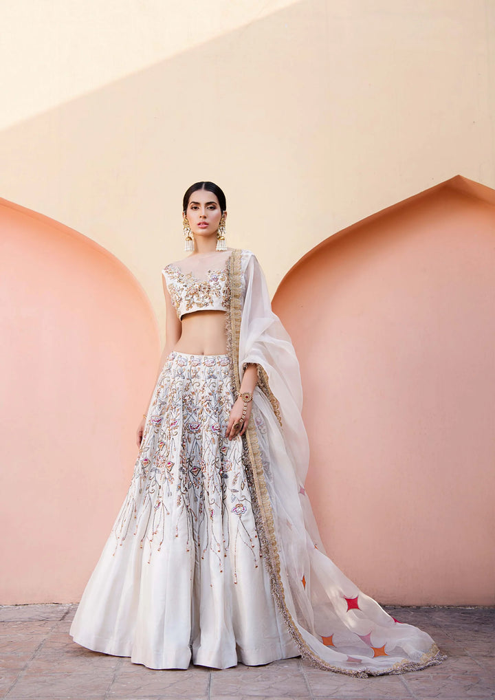 Delicate techniques and intricate craftmanship redifines traditional methods of embellishment making it a unique piece. Resham, uncut crystals, mettallic wires and mukesh is used in embellishment on rawsilk base. This design...