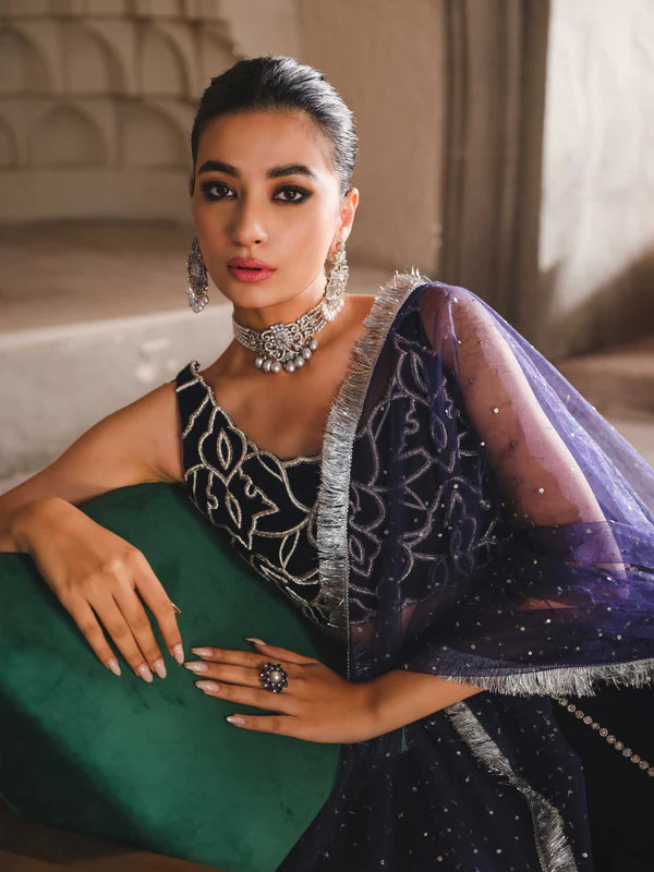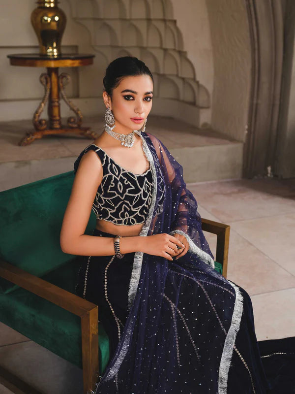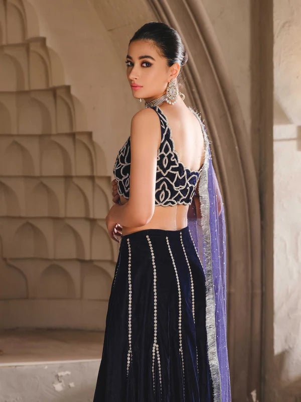 navy blue handworked velvet lehnga set (three piece set) This design is customisable Delivery Time:12 days