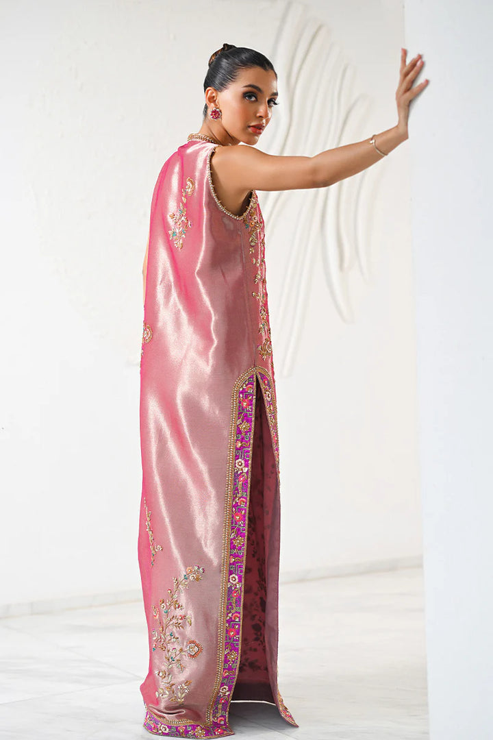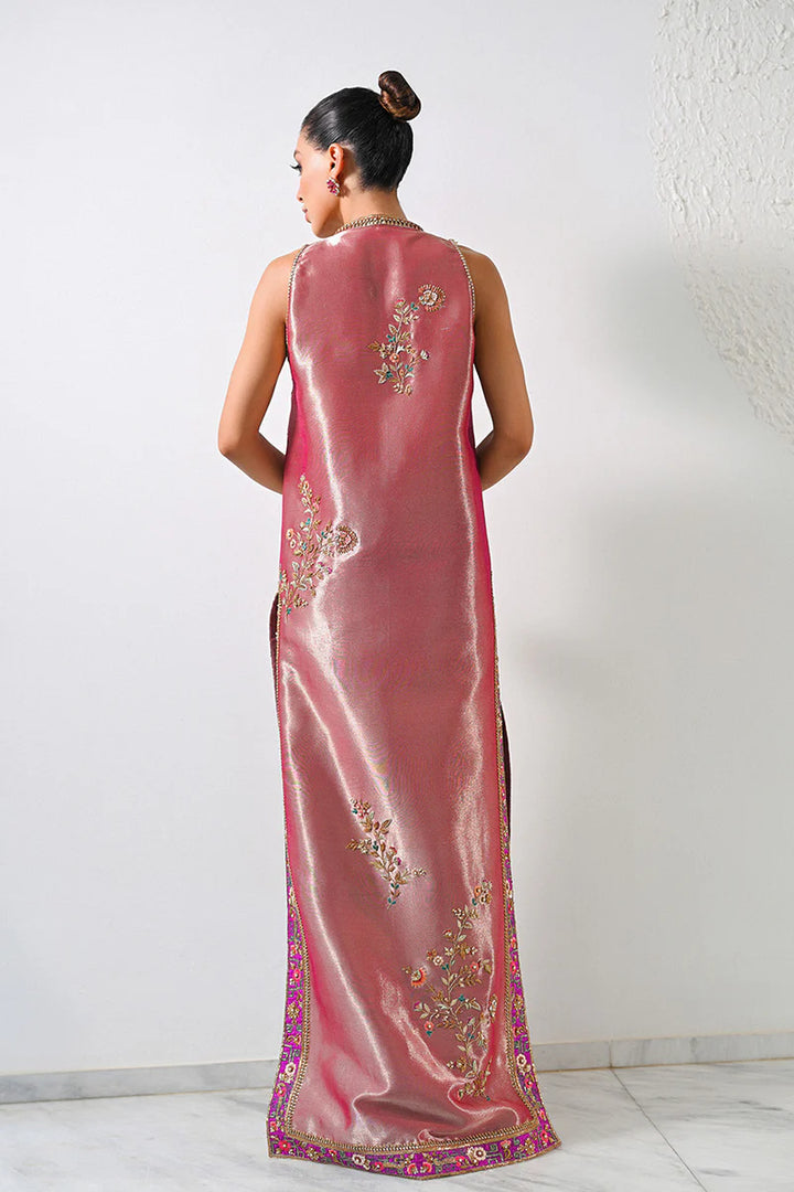 Rendered in metallic hues of champagne pink, a tissue column shirt glistens and gleams unapologetically. The resham and zardoze decadent floral sprigs flow majestically along the entire length of the shirt...