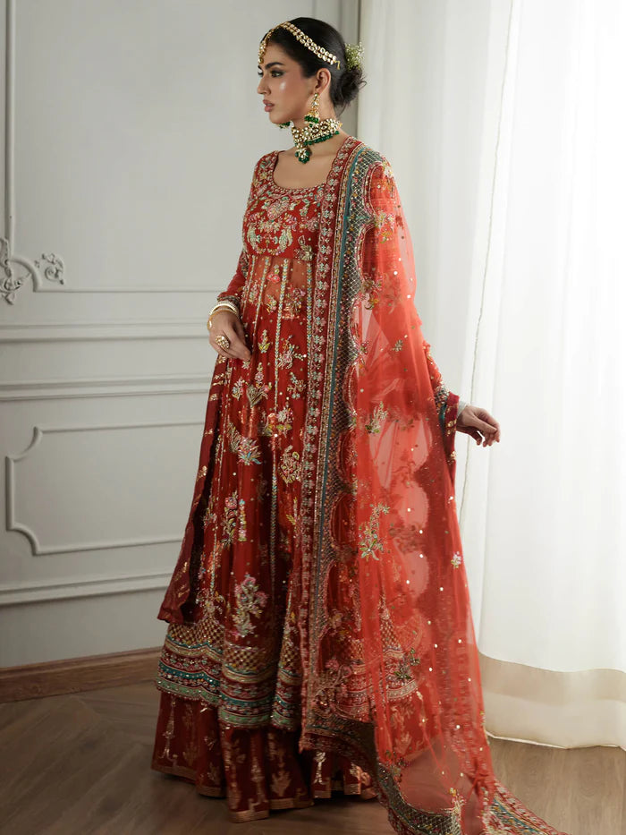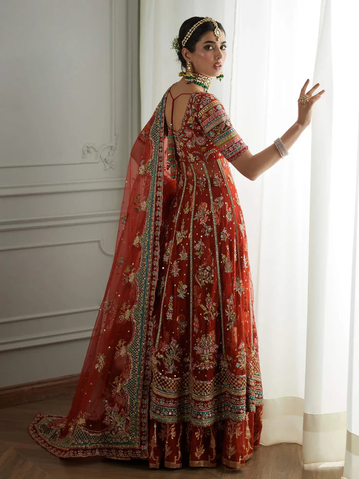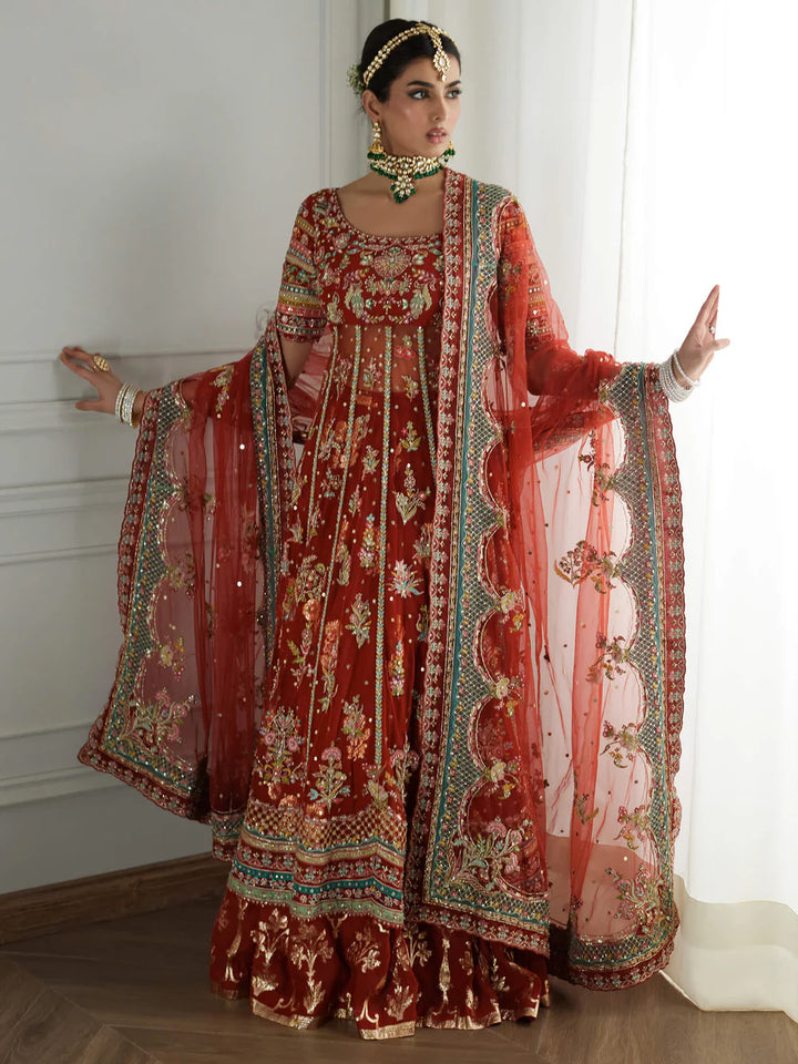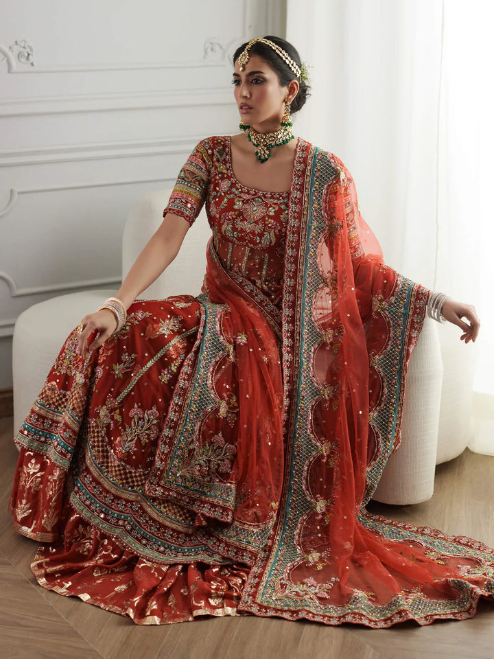 Embrace ethereal elegance with this meticulously crafted cherry tomato red Rumi peshwas, adorned with exquisite multi resham embroidery with applique and zardozi work inspired by traditional and Mughal motifs. This flowing silhouette is paired with a lehenga and a rich complementing dupatta that moves gracefully with every step and is sure to make heads turn.