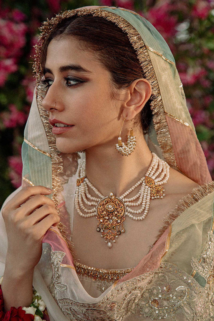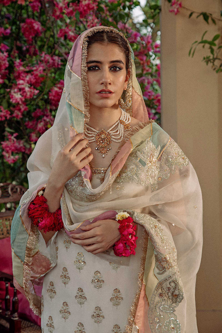 "Saira wears a white fitted raw silk shirt with floral motives, with intricately embellished neckline and border. This look is completed with an old school churidar with chatapatti work and is paired with a chattapati embellished dupatta