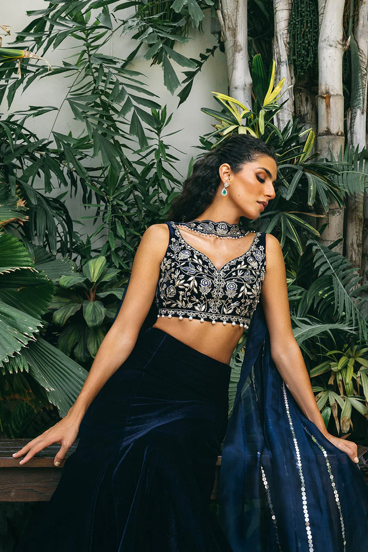 Step into regal elegance with this midnight blue velvet dhaka choli, perfect for a dreamy winter night. The choli dazzles with intricate zardoze embroidery and shimmering pearl accents, setting the stage...